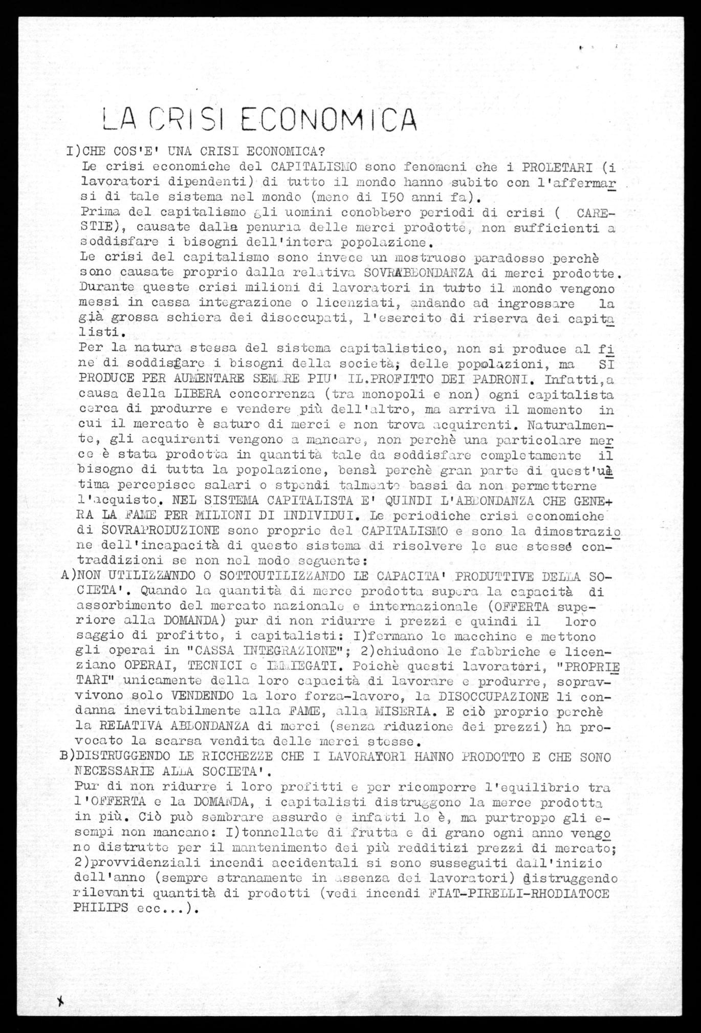 Le crisi economiche del CAP1TALISLO sono fenomeni che i PROLETARI (i lavoratori dipendenti) di tutto il inondo hanno subito con l'affermar . si di tale sistema nel mondo (meno di 150 anni fa). Prima del capitalismo Lli uomini conobbero periodi di crisi ( CARESTIE), causate dalla penuria delle merci prodotto, non sufficienti a soddisfare i bisogni dell'intera popolazione. Le crisi del capitalismo sono invece un mostruoso paradosso .perchè sono causate proprio dalla relativa SOVRABBONDANZA di merci prodotte. Durante queste crisi milioni di lavoratori in tutto il mondo vengono messi in cassa integrazione o licenziati, andando ad ingrossare la già grossa schiera dei disoccupati, l'esercito di riserva dei capita listi.