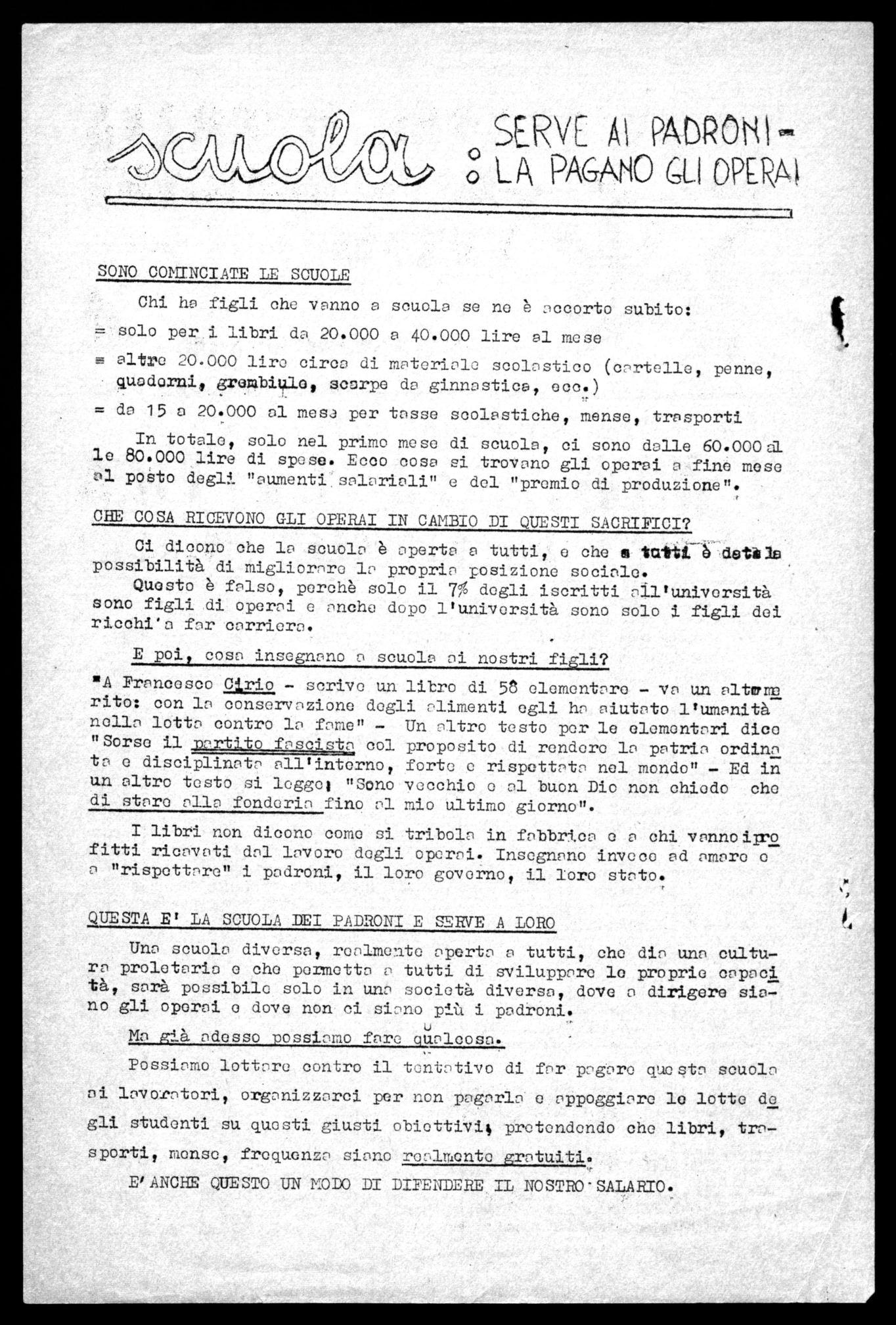 Una scuola diversa, realmente aperta a tutti, che dia una cultu— ra proletaria o che pormetto a tutti di sviluppare lo proprie copoci tà, sarà possibile solo in una società diversa, dove o dirigere sia— no gli oporol o dove non ci siano più i padroni.