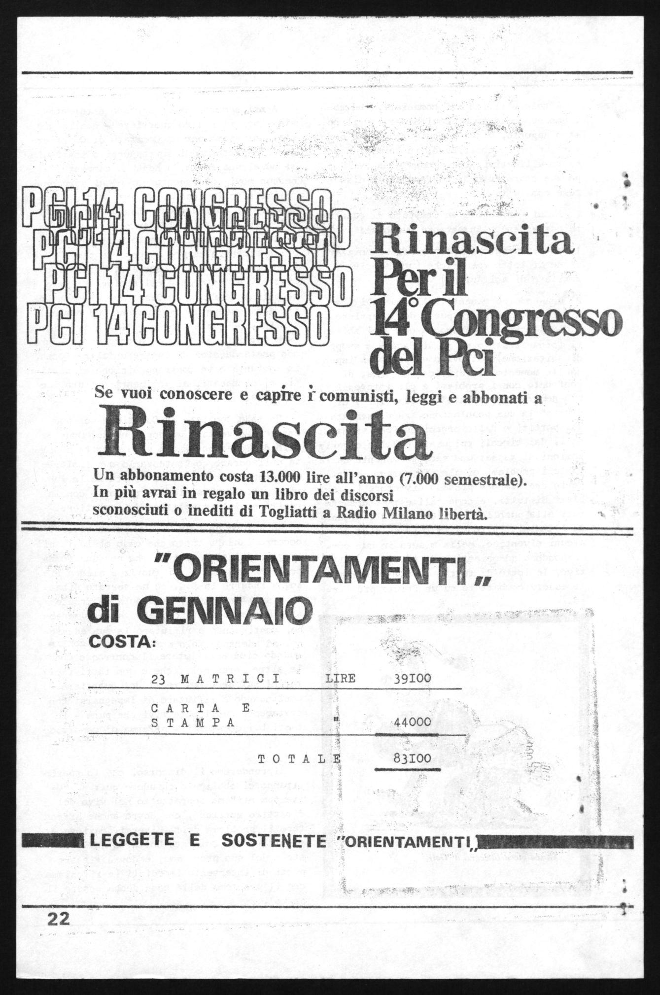 Se vuoi conoscere e capirei comunisti, leggi e abbonati a Rinascita Un abbonamento costa 13.000 lire all'anno (7.000 semestrale). In più avrai in regalo un libro dei discorsi sconosciuti o inediti di Togliatti a Radio Milano libertà. "ORIENTAMENTI di GENNAIO COSTA: 23 MATRICI LIRE 39100 CARTA E STAMPA 44000 TOTALE 83100 LEGGETE E SOSTENETE "ORIENTAMENTI, .....••••••M •Io ~1111...M.M.1•19 4 41 22