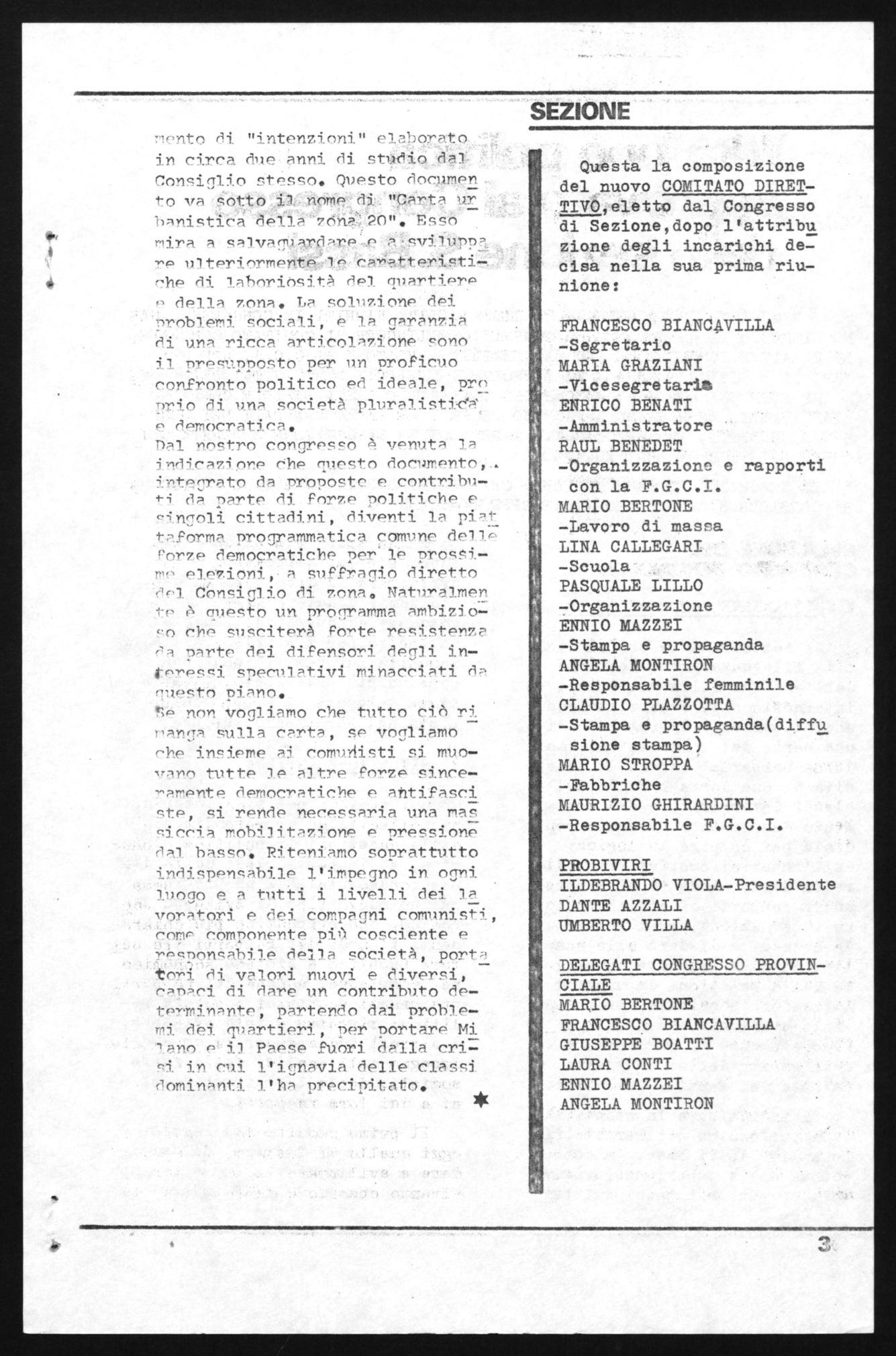 biettivi, ta "Ceesta Urbanistica del H.a Zona 20" approvata dal. Consiglio 'di Zona, la quale il frutto di un grosso impegno unitario in cui è stata preminente l'azione dei no= atri compagni Consiglieri: questo docàmento costituisce la sintesi de gli obiettivi progaeammatici della Sezione sui problemi locali.
