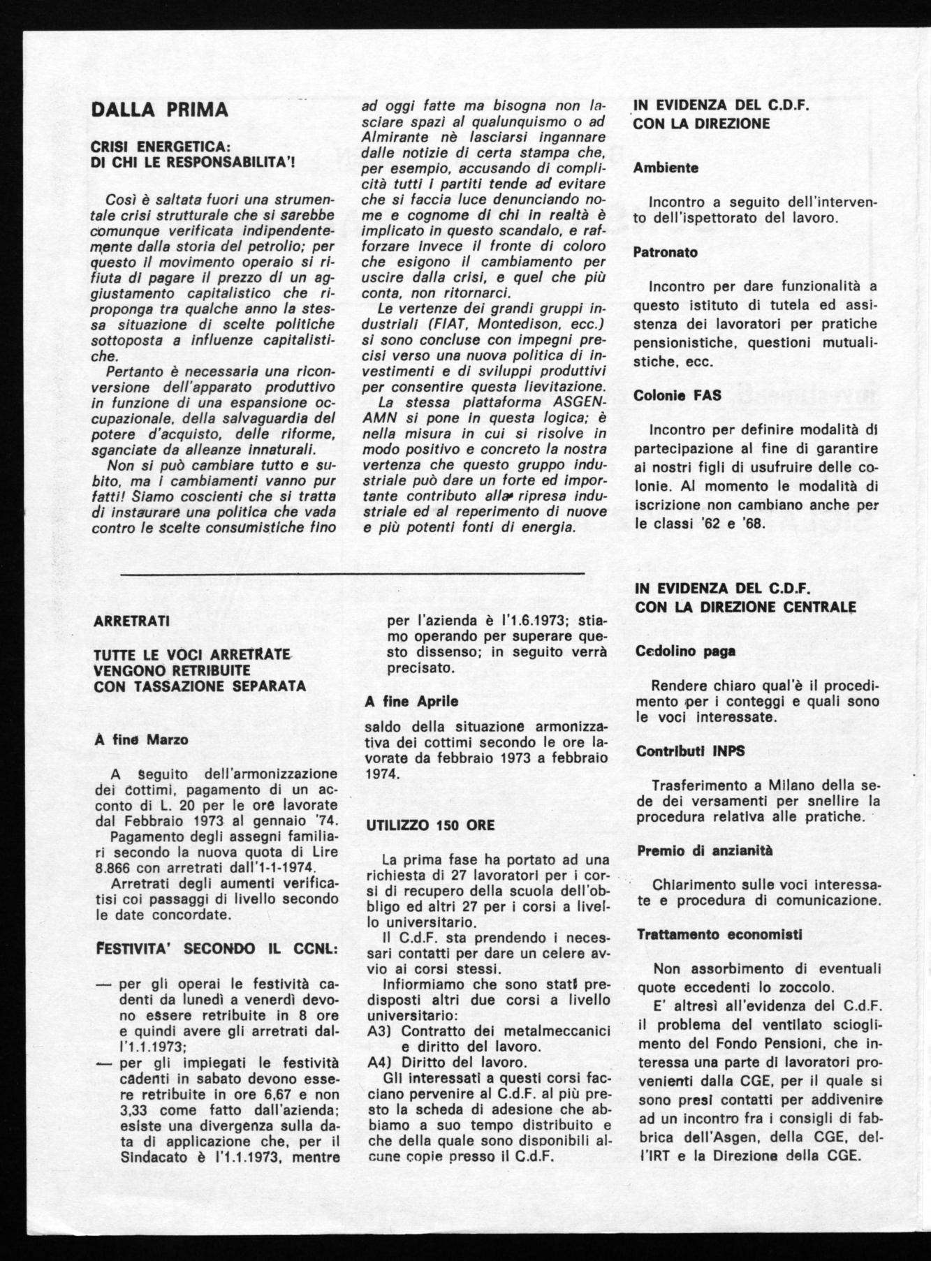 Non assorbimento di eventuali quote eccedenti lo zoccolo. E' altresì all'evidenza del C.d.F. il problema del ventilato scioglimento del Fondo Pensioni, che interessa una parte di lavoratori provenienti dalla CGE, per il quale si sono presi contatti per addivenire ad un incontro fra i consigli di fabbrica dell'Asgen, della CGE, dell'IRT e la Direzione della CGE.