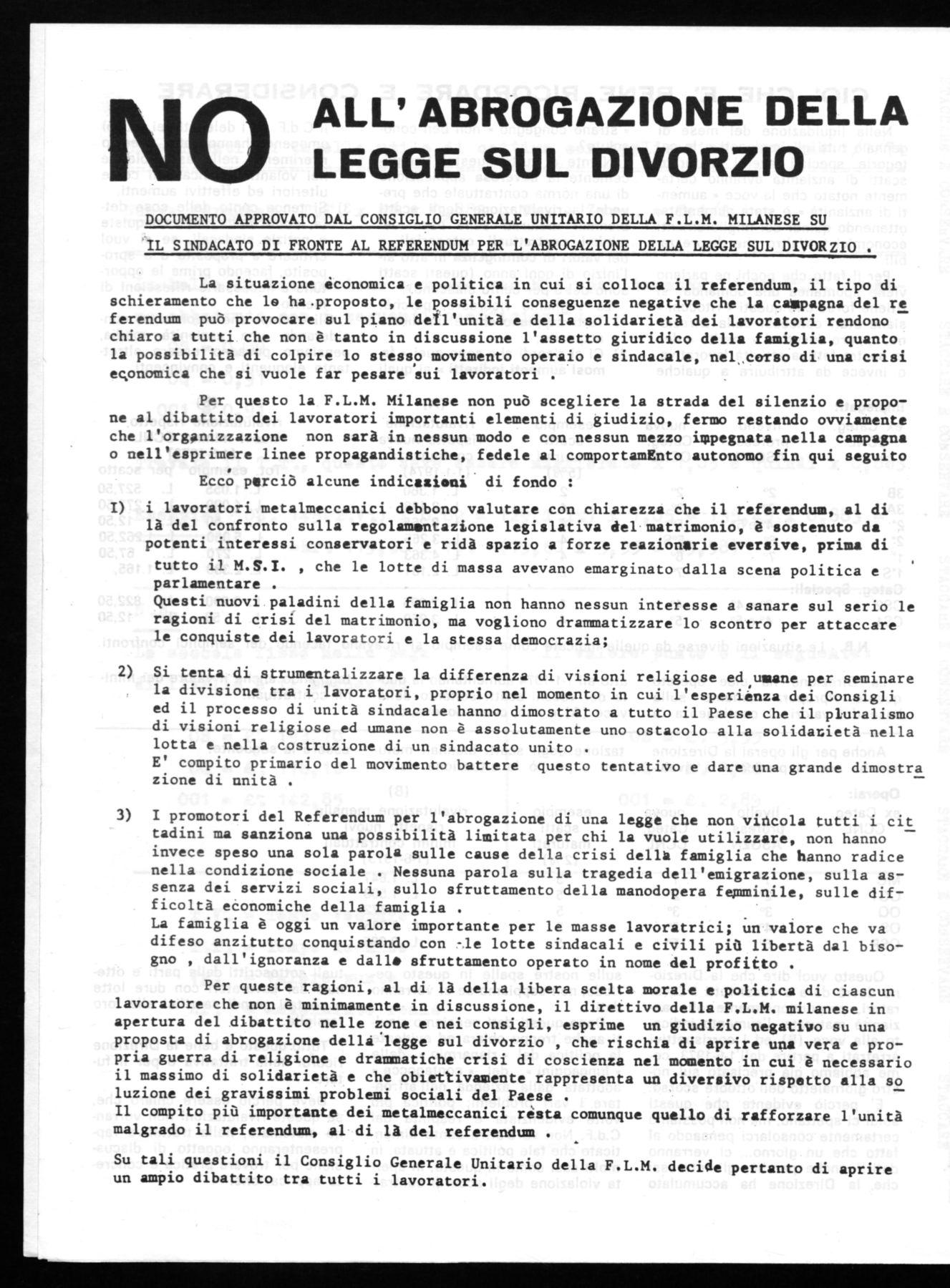 Per queste ragioni, al di là della libera scelta morale e politica di ciascun lavoratore che non è minimamente in discussione, il direttivo della F.L.M. milanese in apertura del dibattito nelle zone e nei consigli, esprime un giudizio negativo su una proposta di abrogazione dellalegge sul divorzio , che rischia di aprire una vera e propria guerra di religione e drammatiche crisi di coscienza nel momento in cui è necessario il massimo di solidarietà e che obiettivamente rappresenta un diversivo rispetto alla so luzione dei gravissimi problemi sociali del Paese .