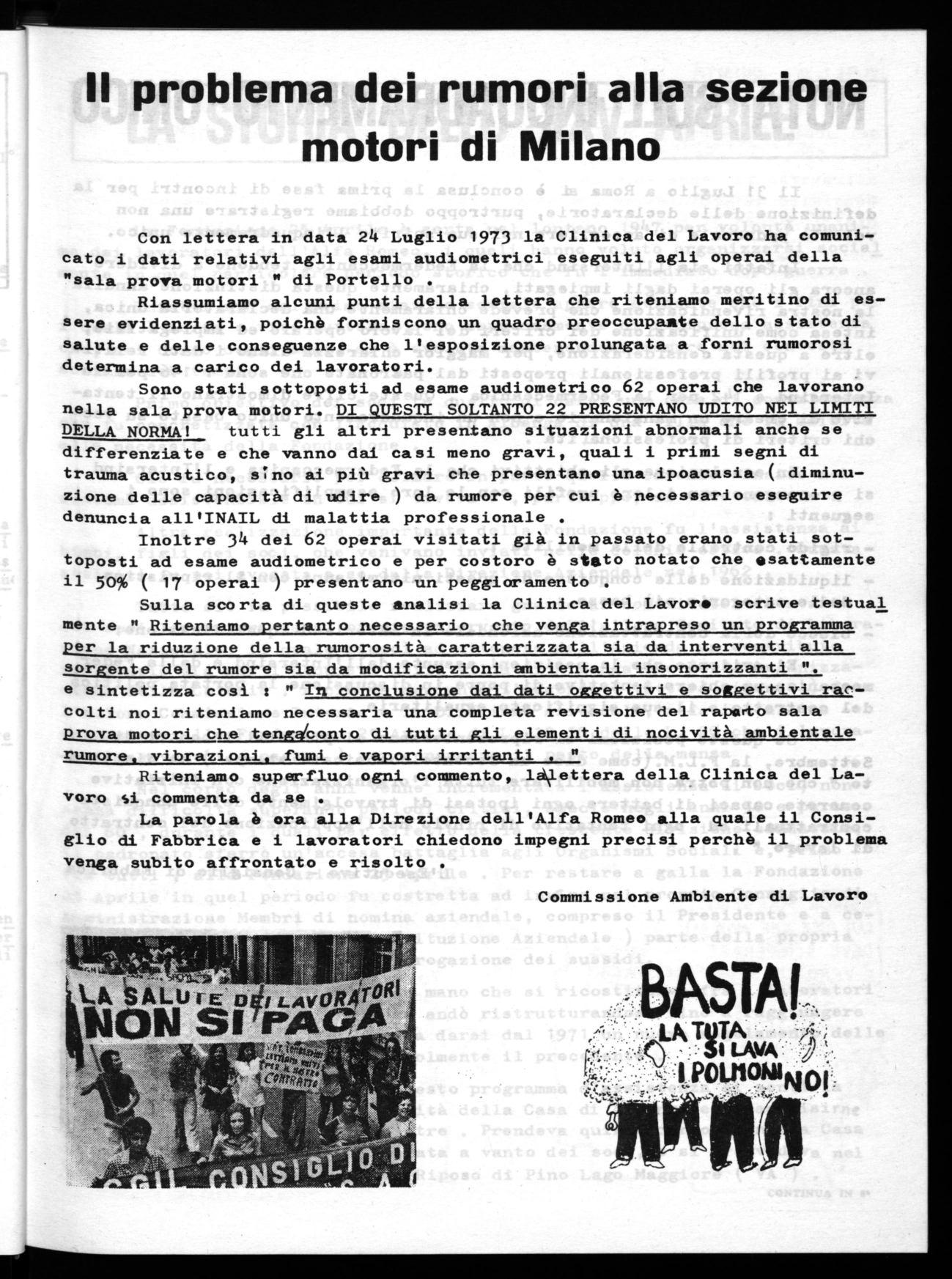 Sulla scorta di queste analisi la Clinica del Lavoro scrive testual mente " Riteniamo pertanto necessario che venga intrapreso un programma per la riduzione della rumorosità caratterizzata sia da interventi alla sorgente del rumore sia da modificazioni ambientali insonorizzanti ". e sintetizza cosa : " In conclusione dai dati oggettivi e soggettivi raccolti noi riteniamo necessaria una completa revisione del raparto sala prova motori che tenga/conto di tutti gli elementi di nocività ambientale rumore, vibrazioni, fumi e vapori irritanti . "