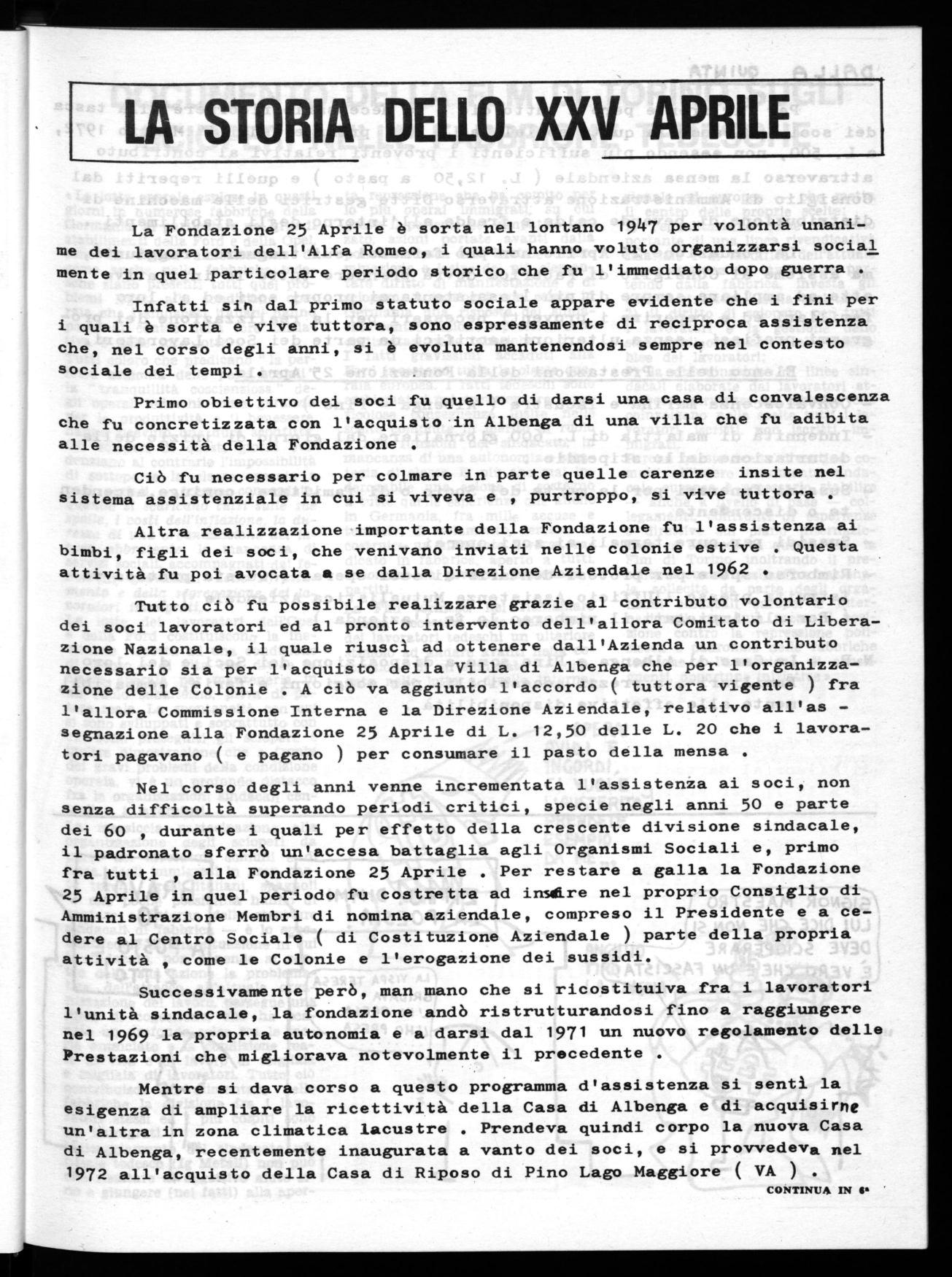 La Fondazione 25 Aprile è sorta nel lontano 1947 per volontà unanime dei lavoratori dell'Alfa Romeo, i quali hanno voluto organizzarsi social mente in quel particolare periodo storico che fu l'immediato dopo guerra .