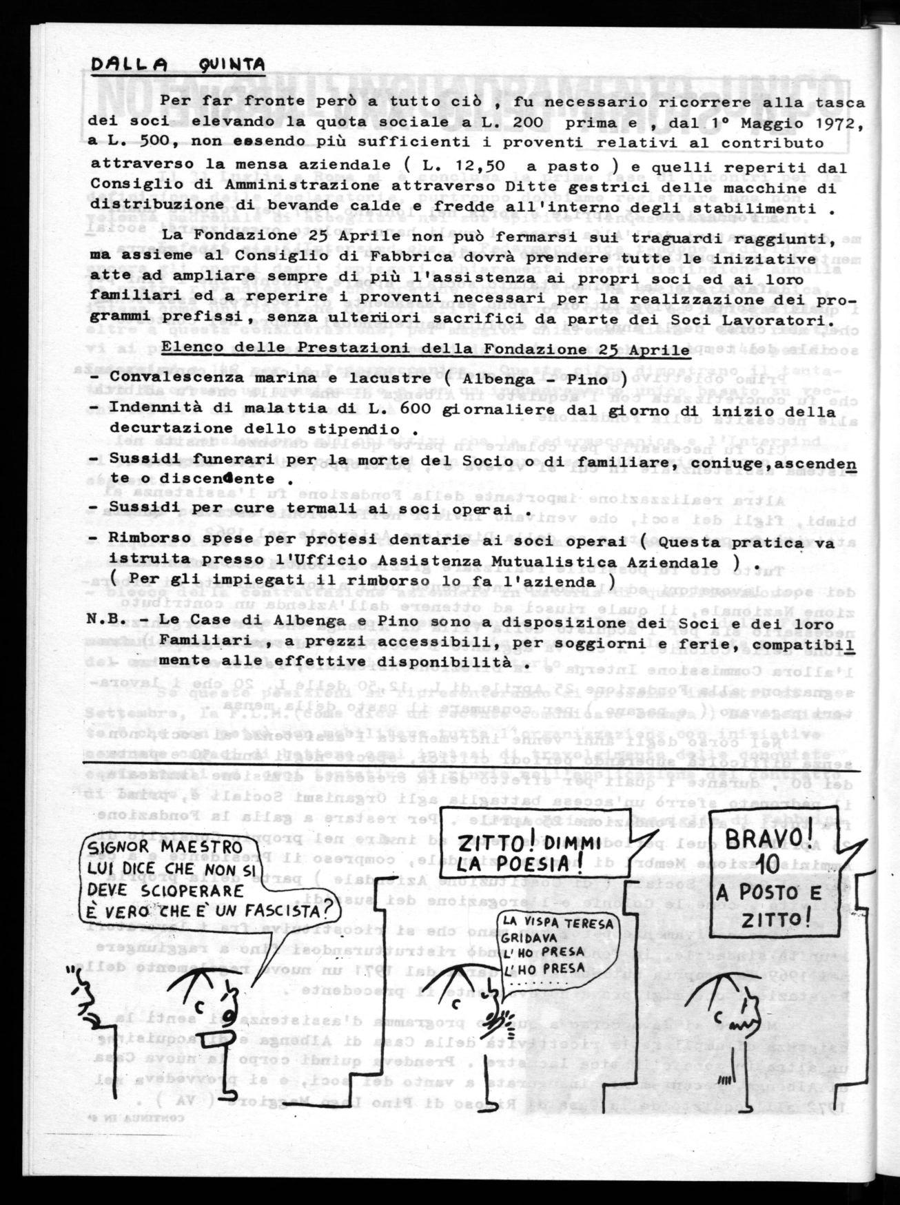 La Fondazione 25 Aprile non può fermarsi sui traguardi raggiunti, ma assieme al Consiglio di Fabbrica dovrà prendere tutte le iniziative atte ad ampliare sempre di più l'assistenza ai propri soci ed ai loro familiari ed a reperire i proventi necessari per la realizzazione dei programmi prefissi, senza ulteriori sacrifici da parte dei Soci Lavoratori.