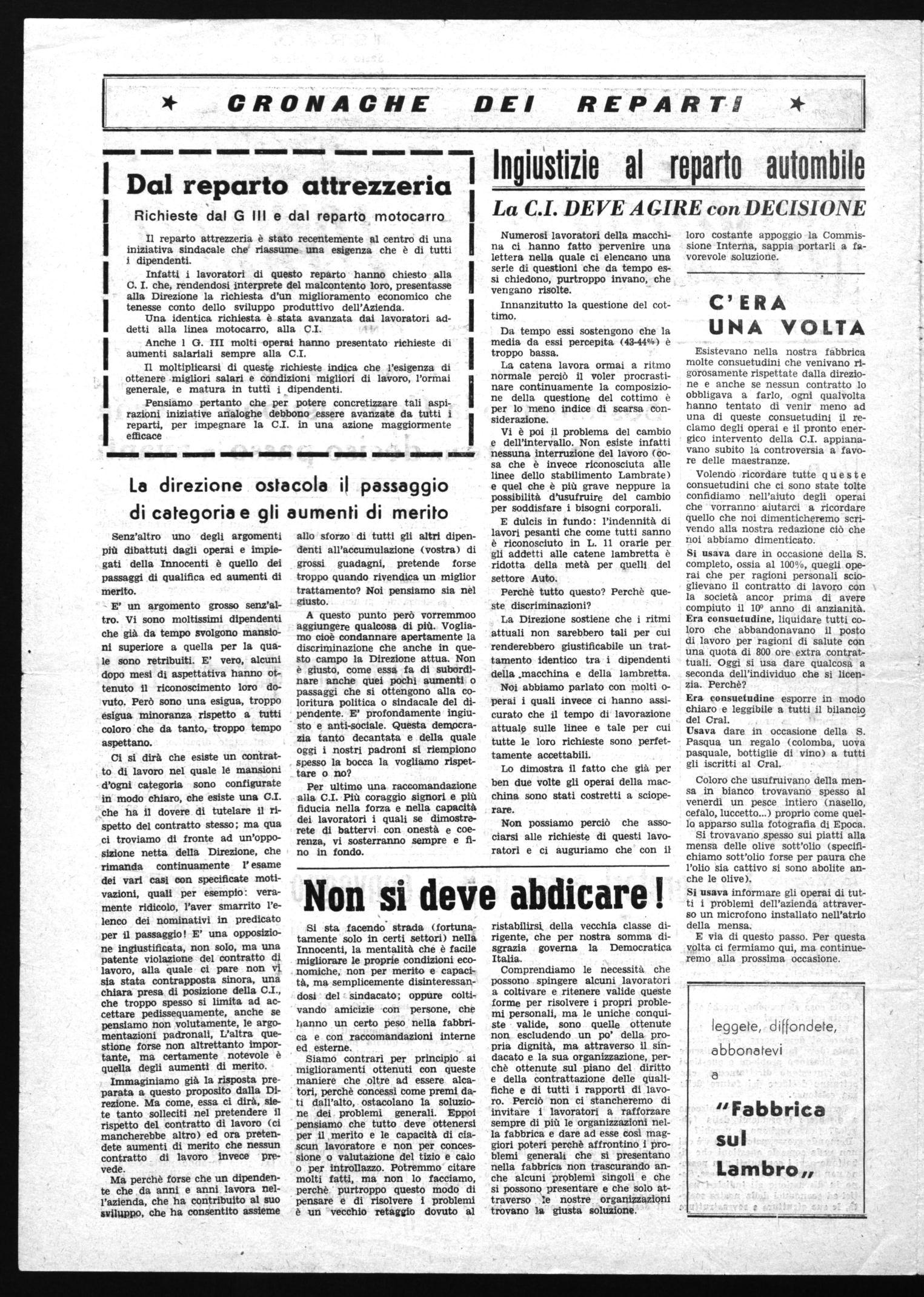 Comprendiamo le necessità che possono spingere alcuni lavoratori a coltivare e ritenere valide queste forme per risolvere i propri problemi personali, ma le uniche conquiste valide, sono quelle ottenute non escludendo un po' della propria dignità, ma attraverso il sindacato e la sua organizzazione, perchè ottenute sul piano del diritto della contrattazione delle qualifiche e di tutti i rapporti di lavoro. Perciò non ci stancheremo di invitare i lavoratori a rafforzare sempre di più le organizzazioni nella fabbrica e dare ad esse così maggiori poteri perchè affrontino i problemi generali che si presentano nella fabbrica non trascurando anche alcuni problemi singoli e che si possono presentare e che solo attraverso Ie nostre organizzazioni trovano la giusta soluzione.