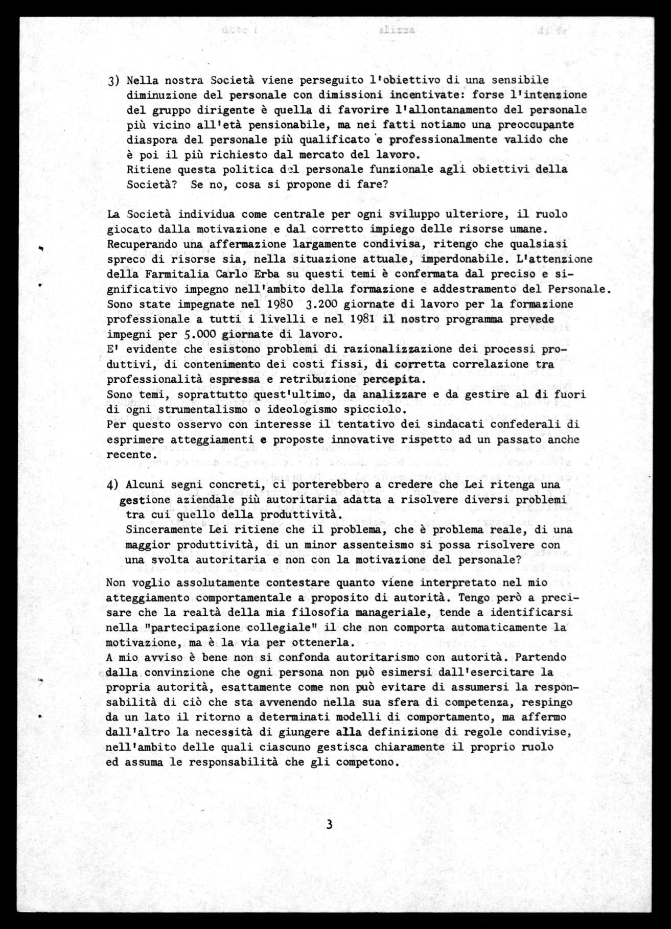 2) L'attuale gruppo dirigente Farmitalia Carlo Erba, segue una politica di ridimensionamento produttivo, cioè di adeguamento alle situazioni dei mercati attuali piuttosto che ricerca di nuovi mercati, creando difficoltà occupazionali.