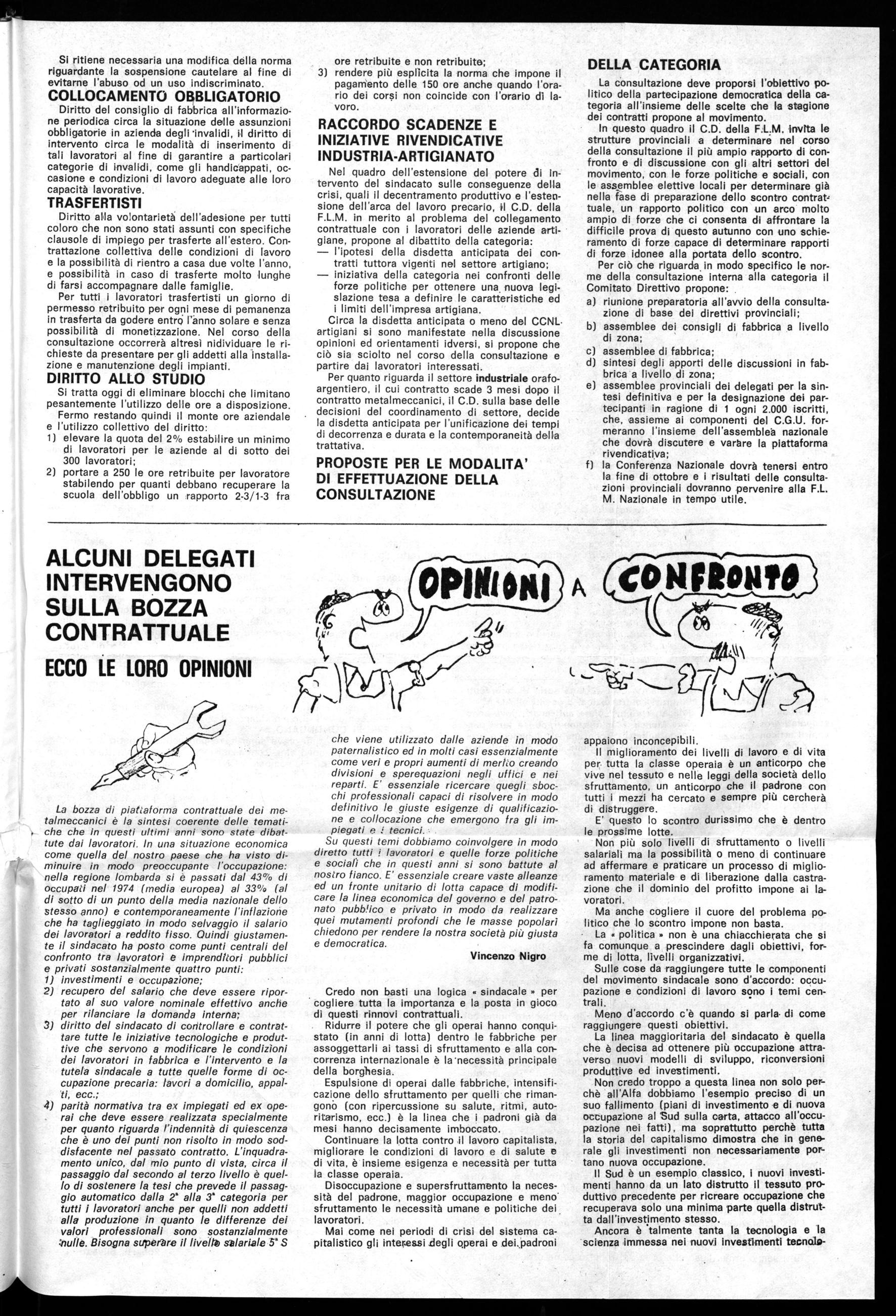 La bozza di piattaforma contrattuale dei metalmeccanici è la sintesi coerente delle tematiche che in questi ultimi anni sono state dibattute dai lavoratori. In una situazione economica come quella del nostro paese che ha visto diminuire in modo preoccupante l'occupazione: nella regione lombarda si è passati dal 43% di occupati nel 1974 (media europea) al 33% (al di sotto di un punto della media nazionale dello stesso anno) e contemporaneamente l'inflazione che ha taglieggiato in modo selvaggio il salario dei lavoratori a reddito fisso. Quindi giustamente il sindacato ha posto come punti centrali del confronto tra lavoratori e imprenditori pubblici e privati sostanzialmente quattro punti: investimenti e occupazione; recupero del salario che deve essere riportato al suo valore nominale effettivo anche per rilanciare la domanda interna; diritto del sindacato di controllare e contrattare tutte le iniziative tecnologiche e produttive che servono a modificare le condizioni dei lavoratori in fabbrica e l'intervento e la tutela sindacale a tutte quelle forme di occupazione precaria: lavori a domicilio, appalti, ecc.; parità normativa tra ex impiegati ed ex operai che deve essere realizzata specialmente per quanto riguarda l'indennità di quiescenza che è uno dei punti non risolto in modo soddisfacente nel passato contratto. L'inquadramento unico, dal mio punto di vista, circa il passaggio dal secondo al terzo livello è quello di sostenere la tesi che prevede il passaggio automatico dalla 2' alla 3' categoria per tutti i lavoratori anche per quelli non addetti alla produzione in quanto le differenze dei valori professionali sono sostanzialmente :nulle. Bisogna supertre il livellZ stlariale 5 S