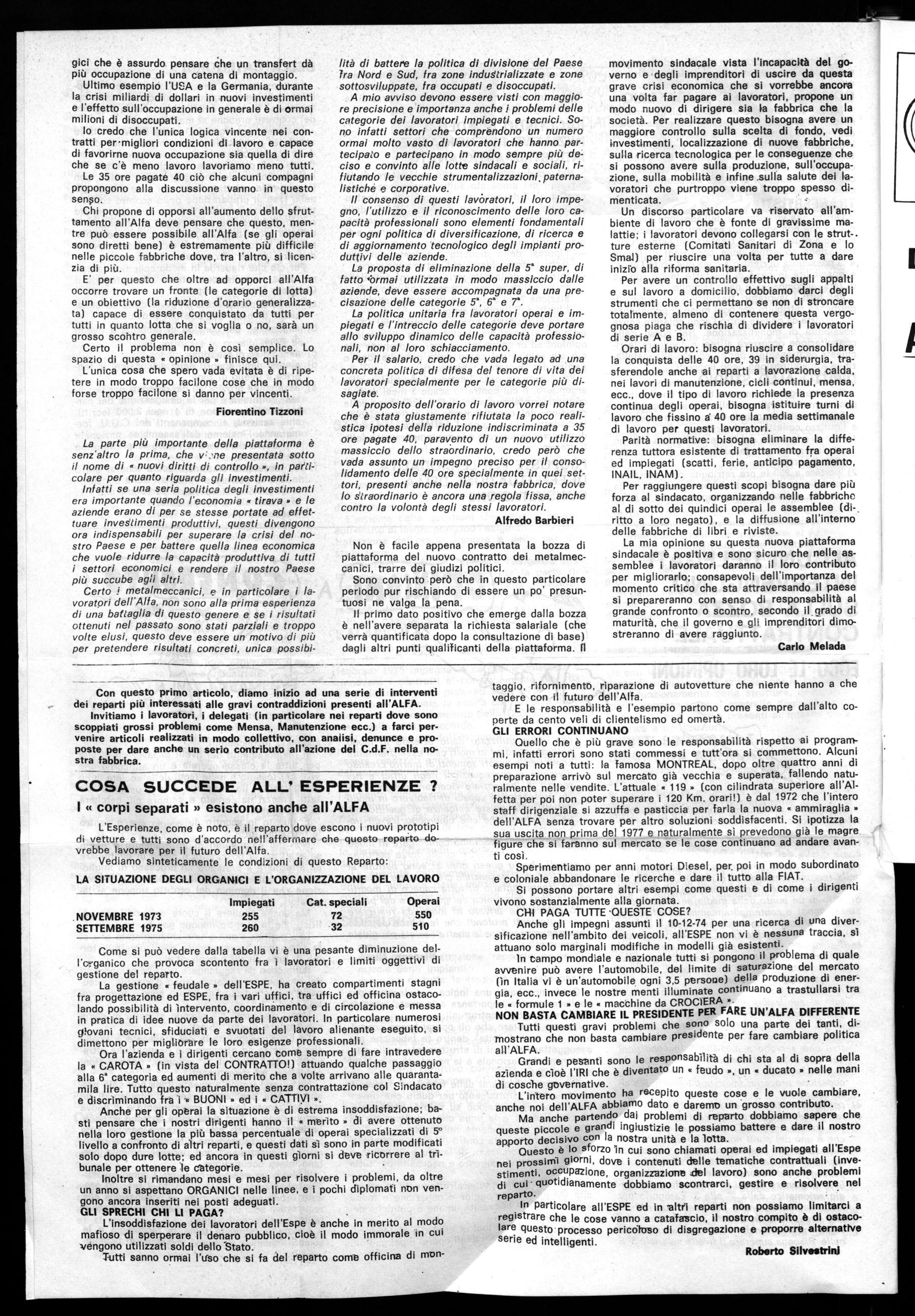 L'intero movimento ha recepito queste cose e le vuole cambiare, anche noi dell'ALFA abbiamo dato e daremo un grosso contributo. Ma anche partendo dai problemi di reparto dobbiamo sapere che queste piccole e grandi ingiustizie le possiamo battere e dare il nostro apporto decisivo con la nostra unità e la lotta.