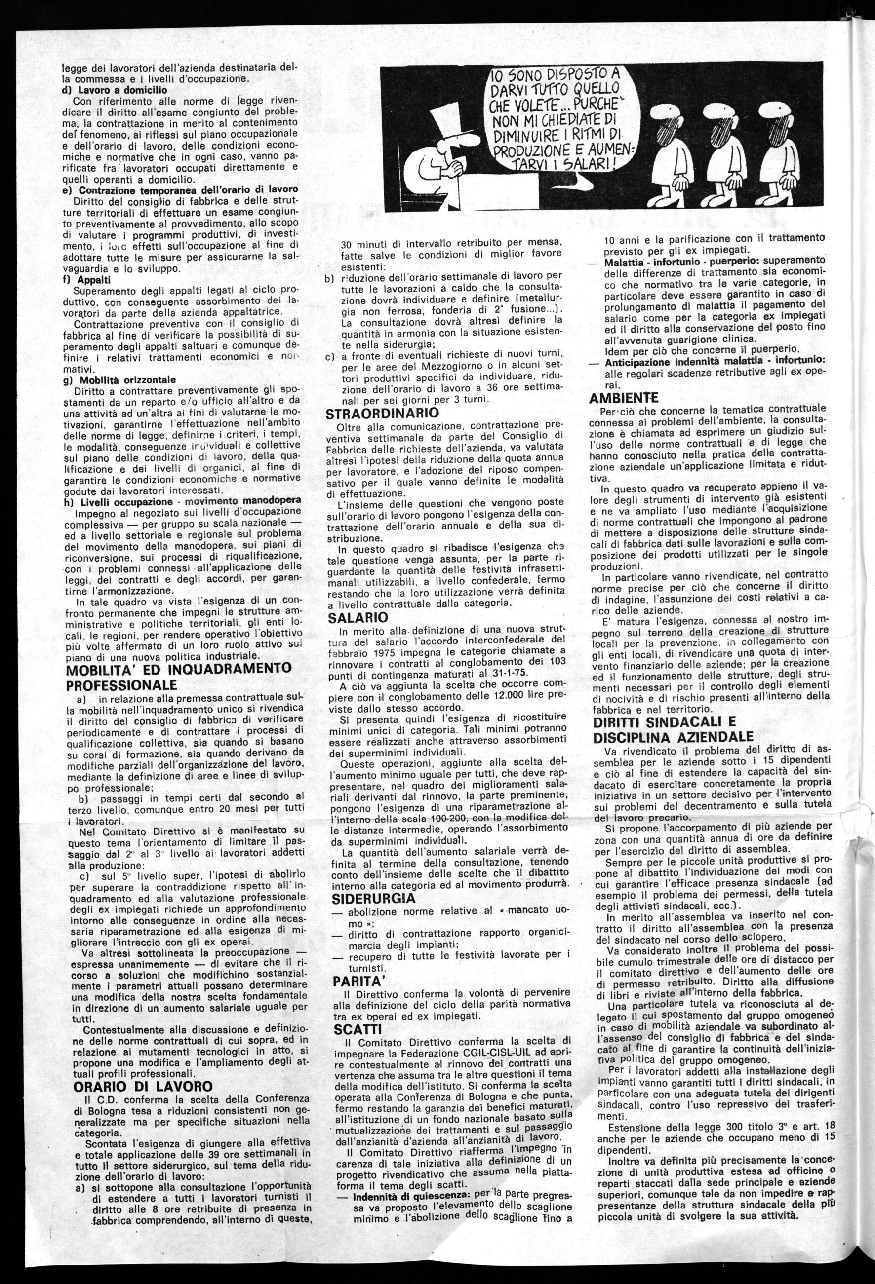 Orari di lavoro: bisogna riuscire a consolidare la conquista delle 40 ore, 39 in siderurgia, trasferendole anche ai reparti a lavorazione calda, nei lavori di manutenzione, cicli continui, mensa, ecc., dove il tipo di lavoro richiede la presenza continua degli operai, bisogna istituire turni di lavoro che fissino à 40 ore la media settimanale di lavoro per questi lavoratori.