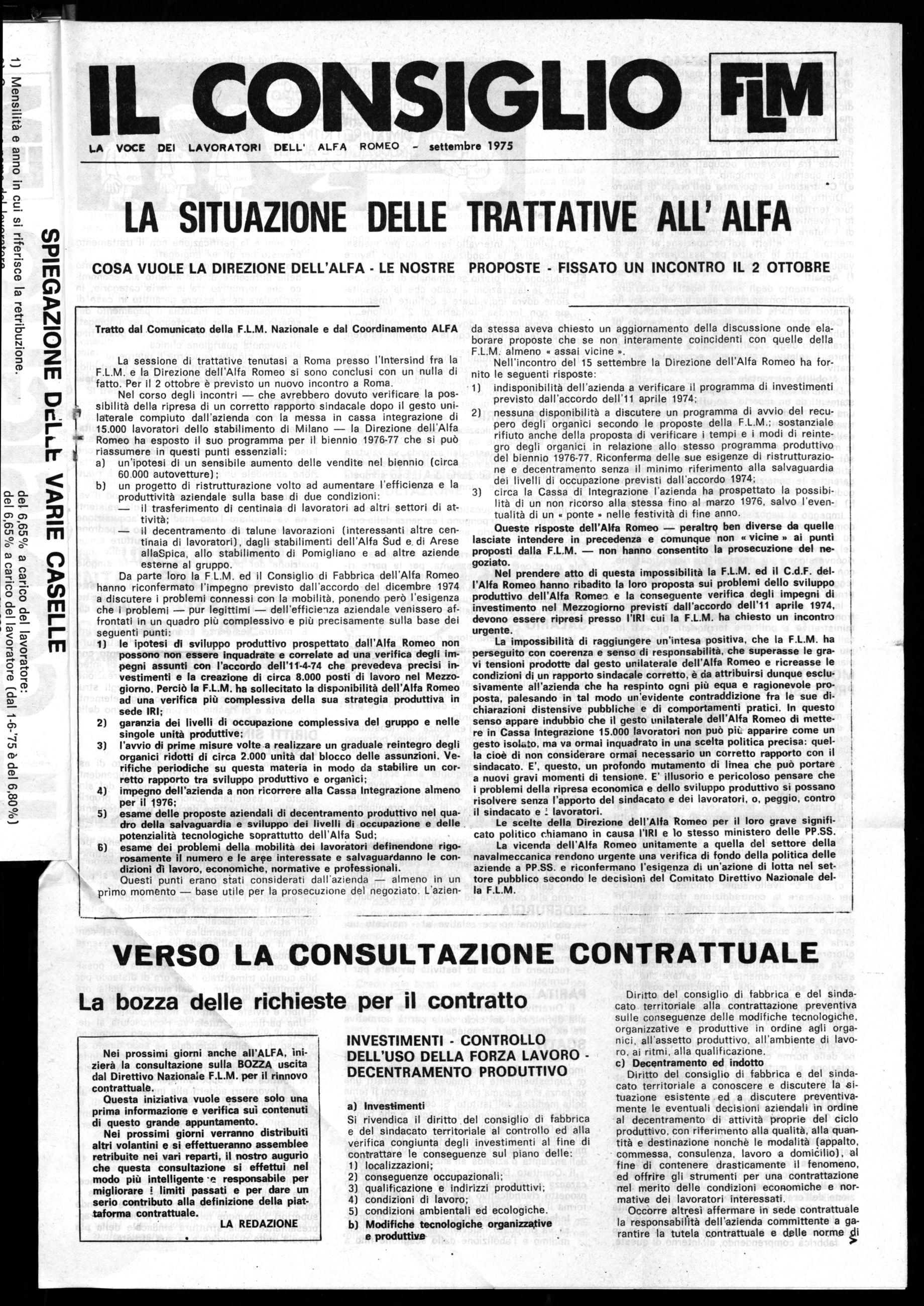 La impossibilità di raggiungere un'intesa positiva, che la F.L.M. ha perseguito con coerenza e senso di responsabilità, che superasse le gravi tensioni prodotte dal gesto unilaterale dell'Alfa Romeo e ricreasse le condizioni di un rapporto sindacale corretto, è da attribuirsi dunque esclusivamente all'azienda che ha respinto ogni più equa e ragionevole proposta, palesando in tal modo un'evidente contraddizione fra le sue dichiarazioni distensive pubbliche e di comportamenti pratici. In questo senso appare indubbio che il gesto unilaterale dell'Alfa Romeo di mettere in Cassa Integrazione 15.000 lavoratori non può pii: apparire come un gesto isokdo, ma va ormai inquadrato in una scelta politica precisa: quella cioè di non considerare ormai necessario un corretto rapporto con il sindacato. E', questo, un profondo mutamento di linea che può portare a nuovi gravi momenti di tensione. E' illusorio e pericoloso pensare che i problemi della ripresa economica e dello sviluppo produttivo si possano risolvere senza l'apporto del sindacato e dei lavoratori, o, peggio, contro il sindacato e lavoratori.