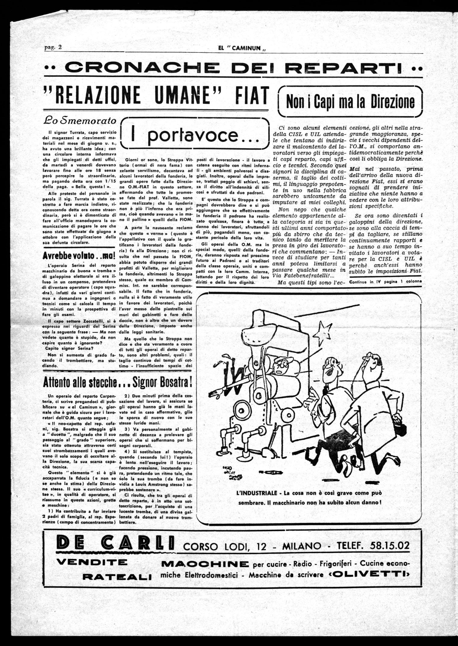Questa notizia ci è giunta da persona per informata, vicina al Parlamento. Invitiamo tutti i lavoratori, a collaborare con la nostra Redazione, scrivendo in : Corso Lodi 58 - Milano - denunciando tutti i soprusi eventualmente ricevuti ; multe, tagli di cottimi, ecc. Queste denuncie serviranno di base alla Commissione Parlamentare d'inchiesta, per porre fine alla dura situazione della nostra fabbrica.