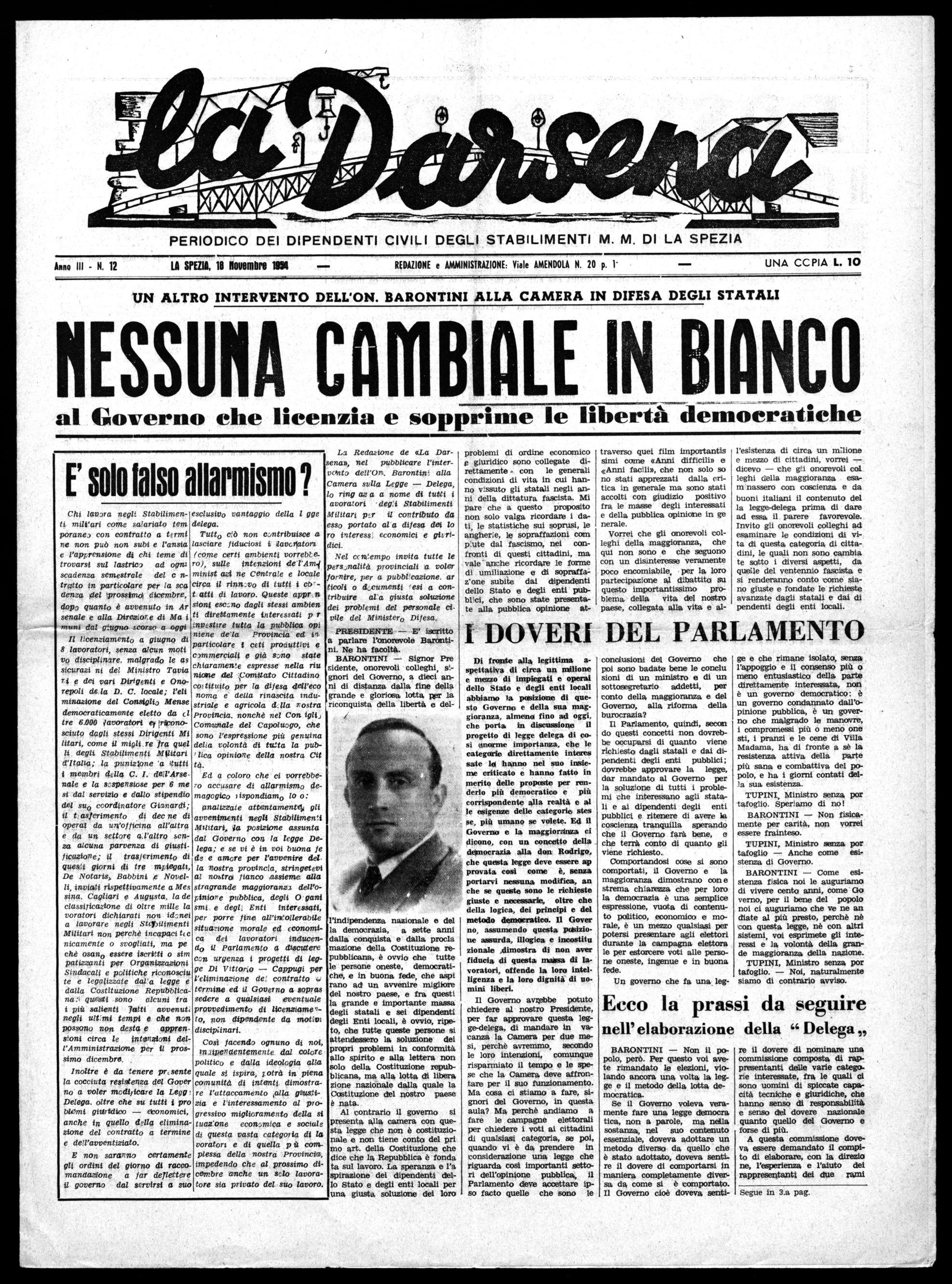 La. Redazione de «La Darsena», nel pubblicare l'intervento Barontini alla Camera sulla Legge — Delega, lo ring az a a nome di tutti i avoratori degli Stabilimenti Militari por il contributo da esso portato al a difesa dei lo ro interessi economici e giiridici.