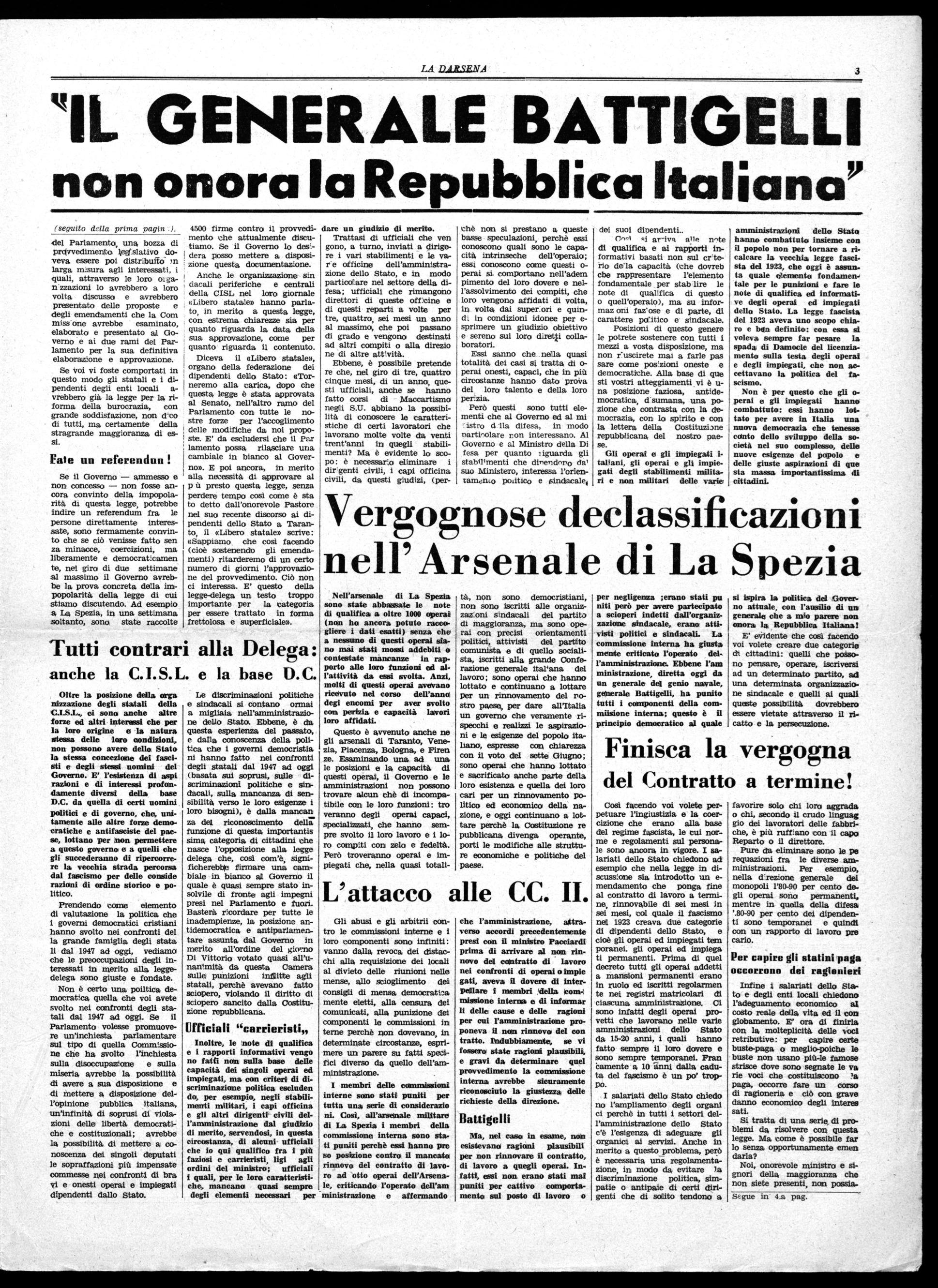 Chi lavora negli Stabilimenti militari come salariato tem poraneo con contratto a terrai ne non può non subi e l'ansia e l'apprensione di chi teme di trovarsi sul lastrico ad ogni scadenza semestrale del e ntrotto in particolare per la sca lenza del prossim0 dicembre. dopo quanto è avvenuto in Ar senale e alla Direziare di Ma i munì dal giugno scorso a oggi Il licenziamento a giugno di 8 lavoratori, senza alcun moti vo disciplinare. malgrado le as sicurazi nì del Ministro Tavia ri e dei vari Dirigenti e 0710repoli de la D. C. locale; l'eli minazione del Consiglia Mense democraticamente eletto da cl tre 6.000 'avoratori er!ritconDsciuto dagli stessi Dirigenti Mi litari, come il migli re fra quel li degli Stabilimenti Militari d'Italia; la punizione 'a tutti i membri della C. I. de:l'Arsenale e la sispensiose per 6 me si dal servizio e dallo stipendio del suo coordinatore Gianardi; il t. asferimento di dee ne di operai da un'officina all'altra e da un settore a.l'altro senza alcuna parvenza di giustificazione; il trasferimento di questi giorni di tre mpiegatt, De Notaris, Babbini ,e Novelli, inviati rispettivamente a Mes sina. Cagliari e Augusta, la de classificazione di oltre mille la voratori dichiarati non idonei a lavorare negli Stcytilimenti Militari non perché incapaci tee nicamente o svogliati, ma pe ché osano essere iscritti o sim patizzanti per Organizzazioni Sindacali e politiche riconosciu te e legalizzate dal'a legge e dalla Costituzione Repubblicana» questi sono alcuni tra i più salienti fatti avvenuti negli ultimi tempi e che non possono non desta e apprensioni circa le intenzioni dell'Amministrazione per il prossimo dicembre.