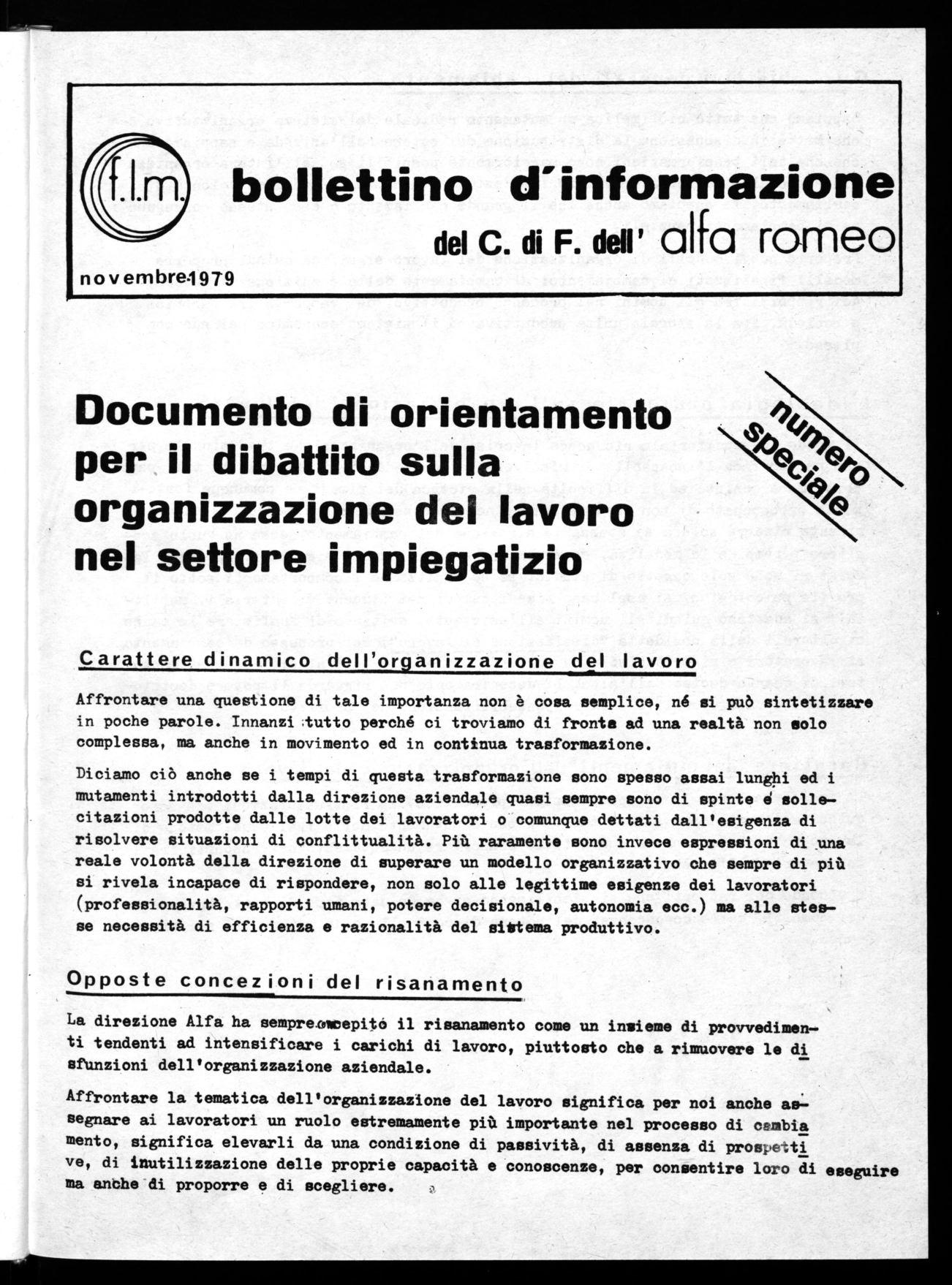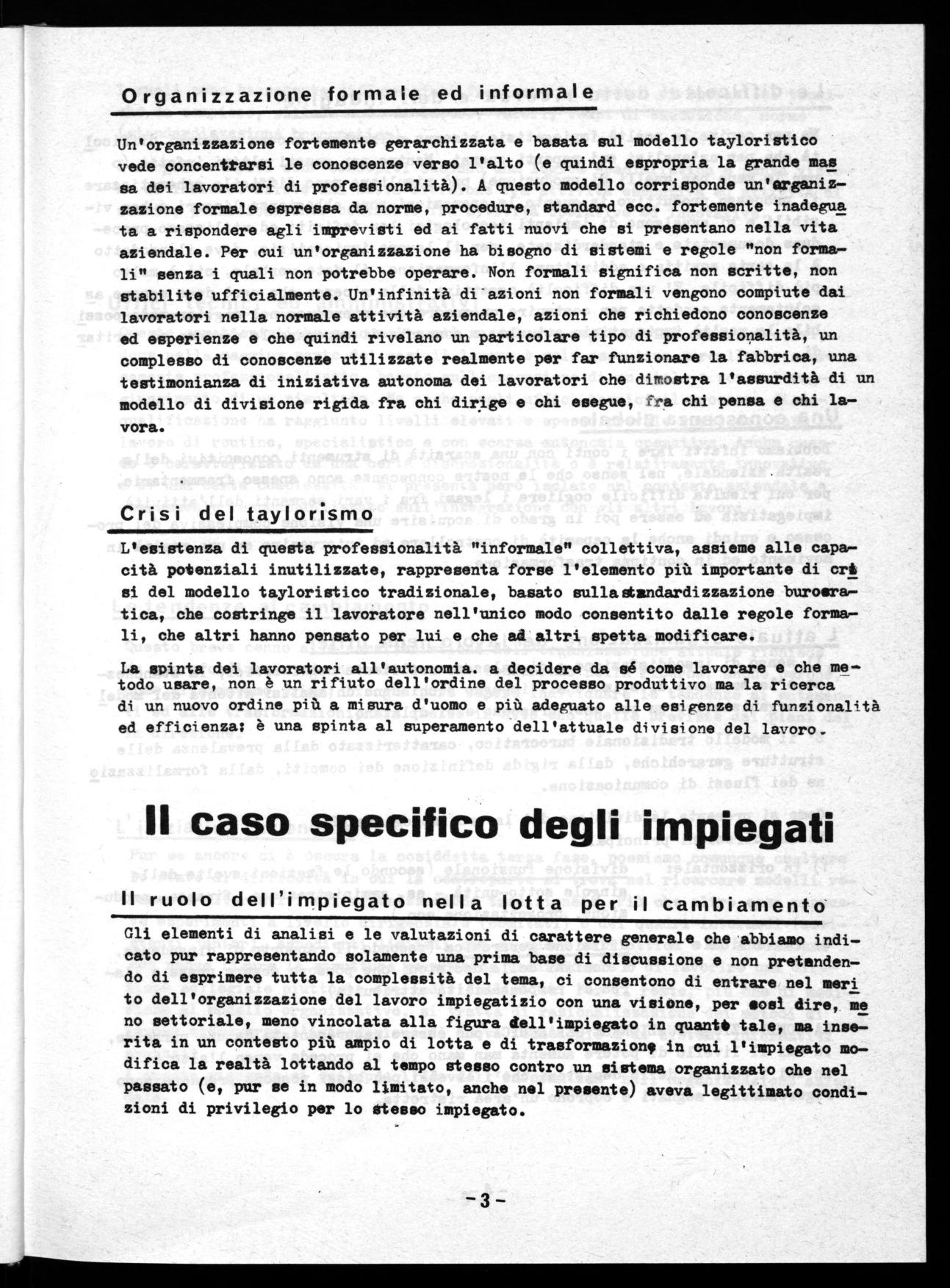Gli elementi di analisi e le valutazioni di carattere generale che abbiamo indicato pur rappresentando solamente una prima base di discussione e non pretendendo di esprimere tutta la complessità del tema, ci consentono di entrare nel meri to dell'organizzazione del lavoro impiegatizio con una visione, per *osi dire, me no settoriale, meno vincolata alla figura dell'impiegato in quanti> tale, ma inserita in un contesto più ampio di lotta e di trasformazione in cui l'impiegato modifica la realtà lottando al tempo stesso contro un sistema organizzato che nel passato (e, pur se in modo limitato, anche nel presente) aveva legittimato condizioni di privilegio per lo stesso impiegato. 3