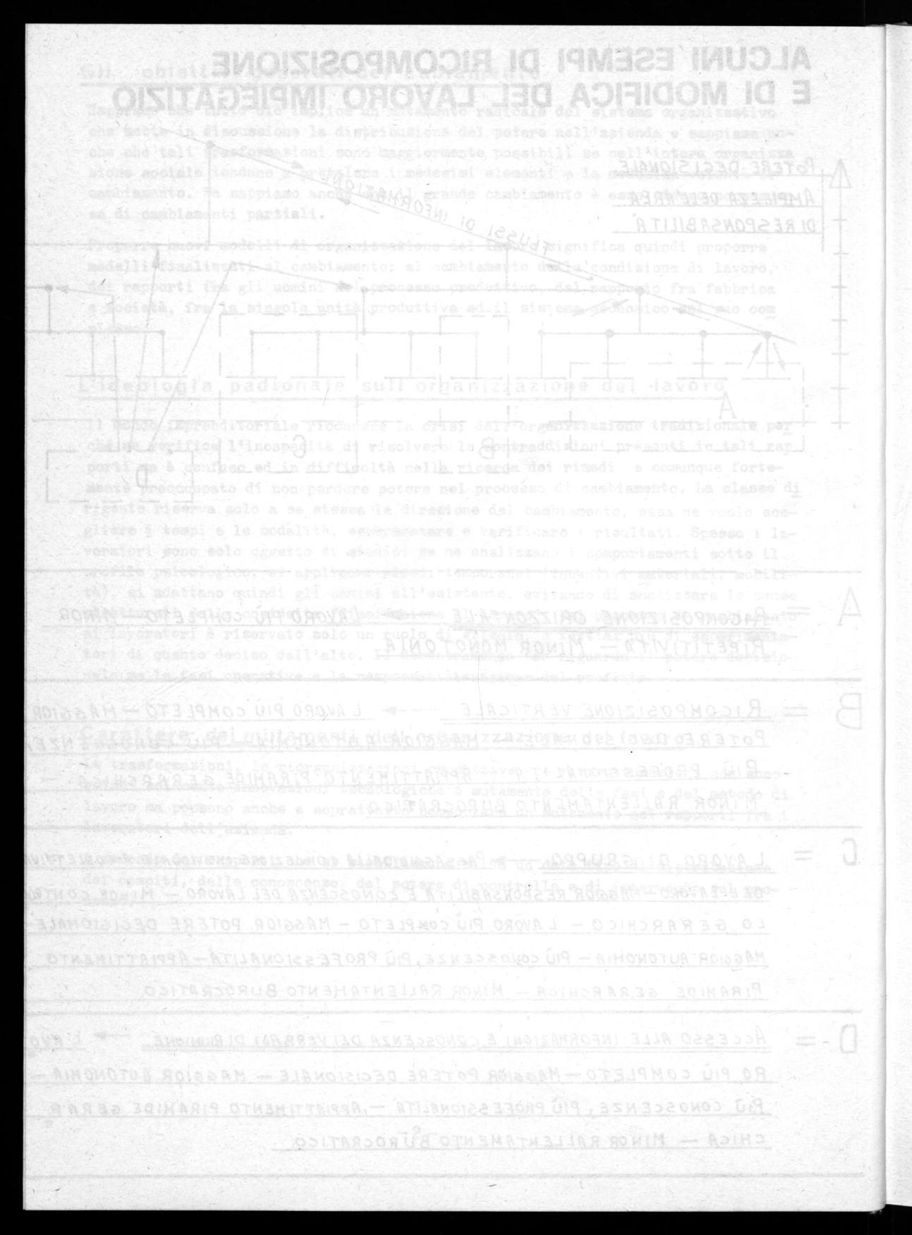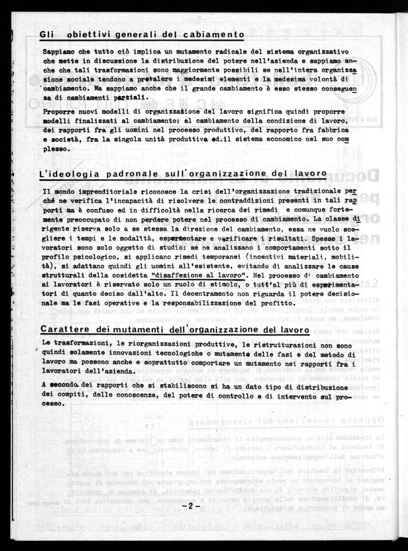 Affrontare la tematica dell'organizzazione del lavoro significa per noi anche assegnare ai lavoratori un ruolo estremamente più importante nel processo di cambia mento, significa elevarli da una condizione di passività, di assenza di prospetti ve, di inutilizzazione delle proprie capacità e conoscenze, per consentire loro di eseguire ma anche di proporre e di scegliere.