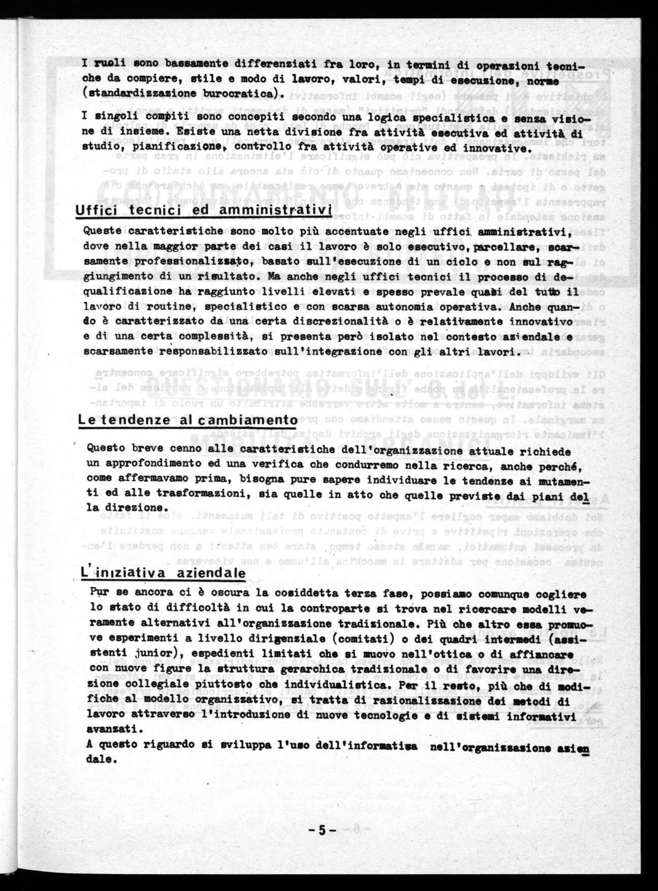 Queste caratteristiche sono molto più accentuate negli uffici amministrativi, dove nella maggior parte dei casi il lavoro è solo esecutivo,parcellare, scarsamente professionalizzato, basato sull'esecuzione di un ciclo e non sul raggiungimento di un risultato. Ma anche negli uffici tecnici il processo di dequalificazione ha raggiunto livelli elevati e spesso prevale quali del tu1 il lavoro di routine, specialistico e con scarsa autonomia operativa. Anche quando è caratterizzato da una certa discrezionalità o è relatitamente innovativo e di una certa complessità, si presenta però isolato nel contesto aziendale e scarsamente responsabilizzato sull'integrazione con gli altri lavori.