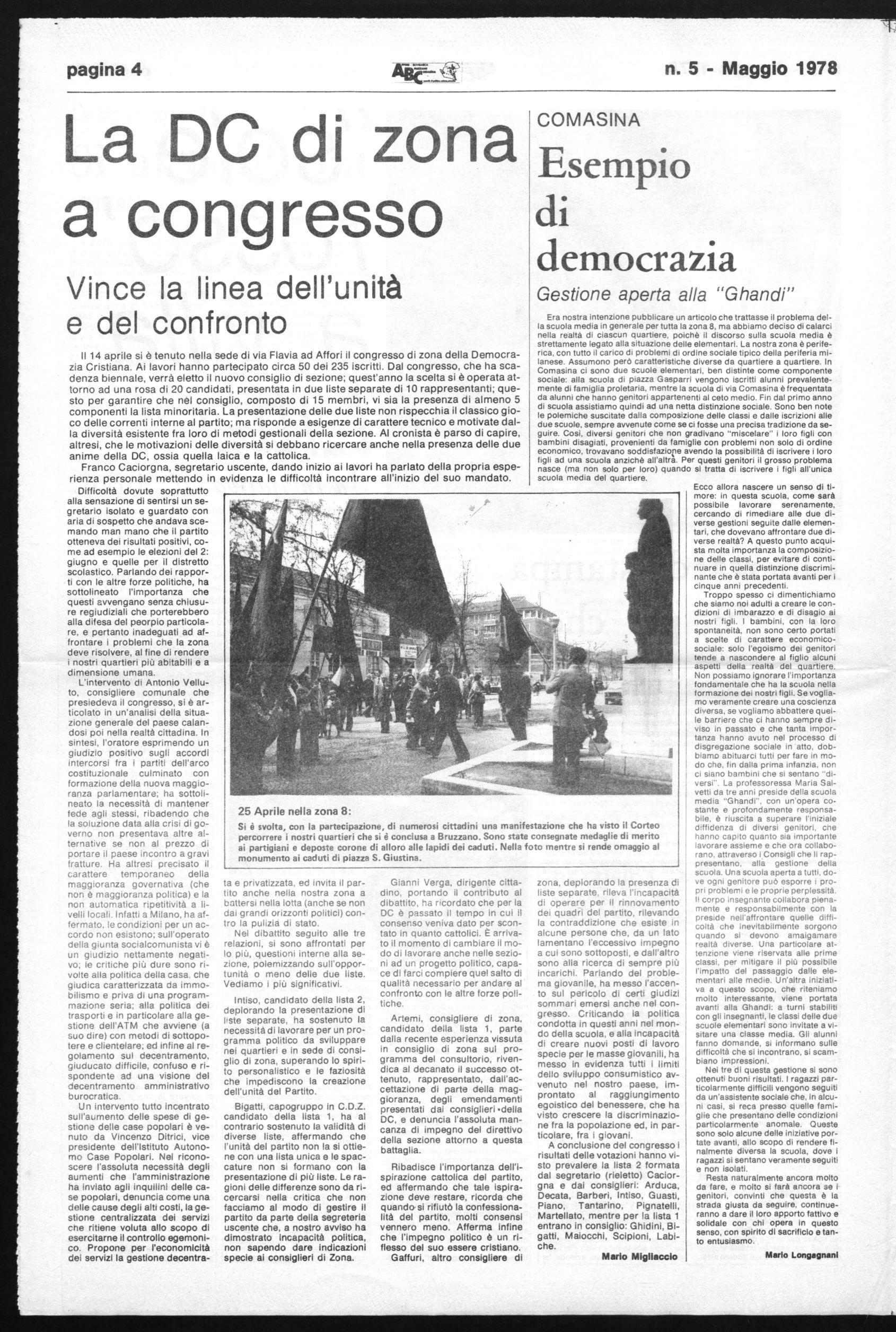 Se il vostro è un partito che si definisce popolare e antifascista, come si spiega allora che per la prima volta, e solo dopo i tragici fatti del 16 marzo si sono viste sfilare le bandiere della DC assieme a quelle del PCI e degli altri partiti? E come mai nella nostra zona, non si è avuta l'adesione alla manifestazione del 25 aprile?