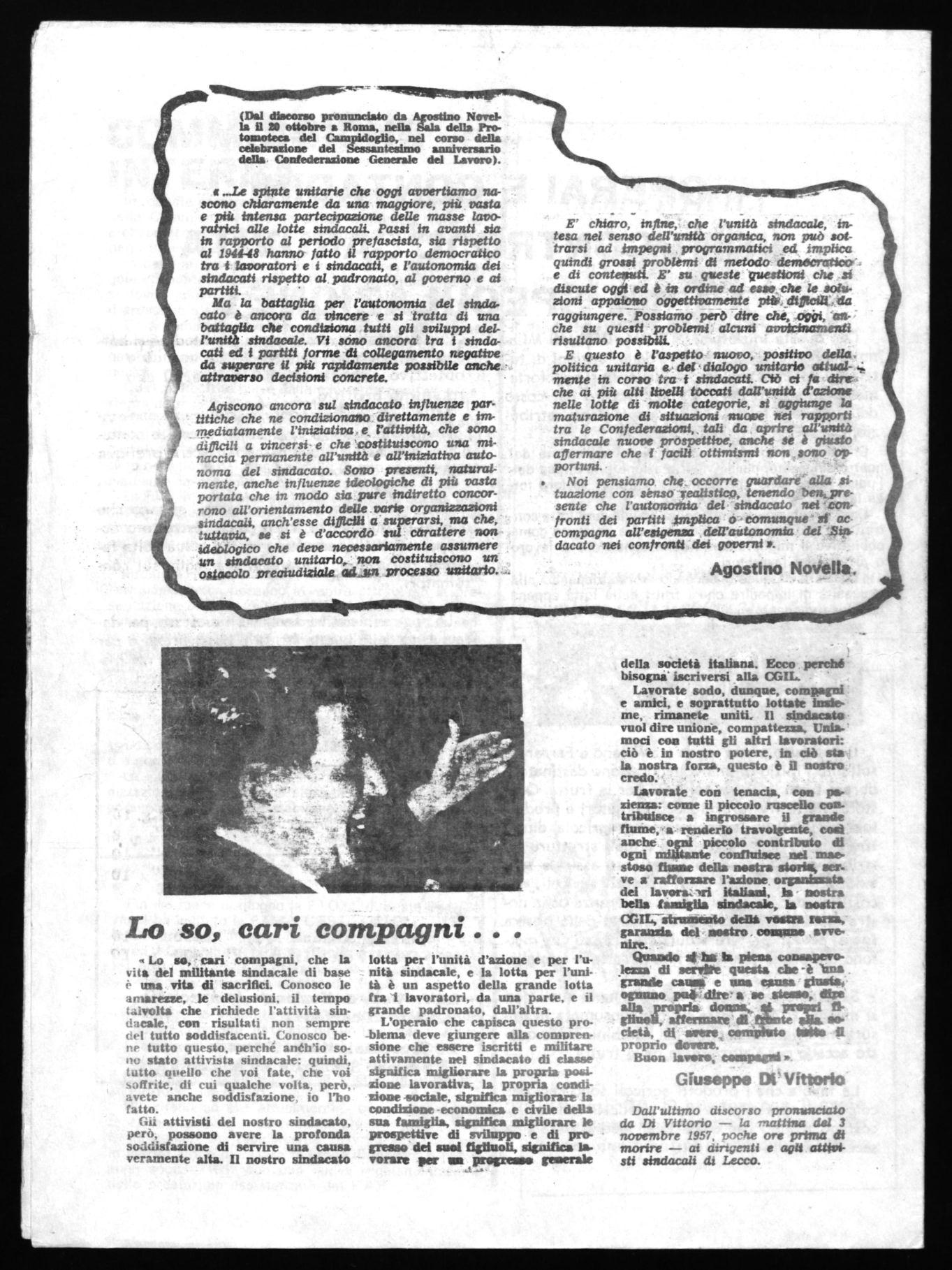 Dall'ultimo disco; se pronunciato da Di Vittorio — la mattina del 3 novembre 1957, poche ore prima di morire — ai chrtgenti e agii attétristi sindacali di Lecco.