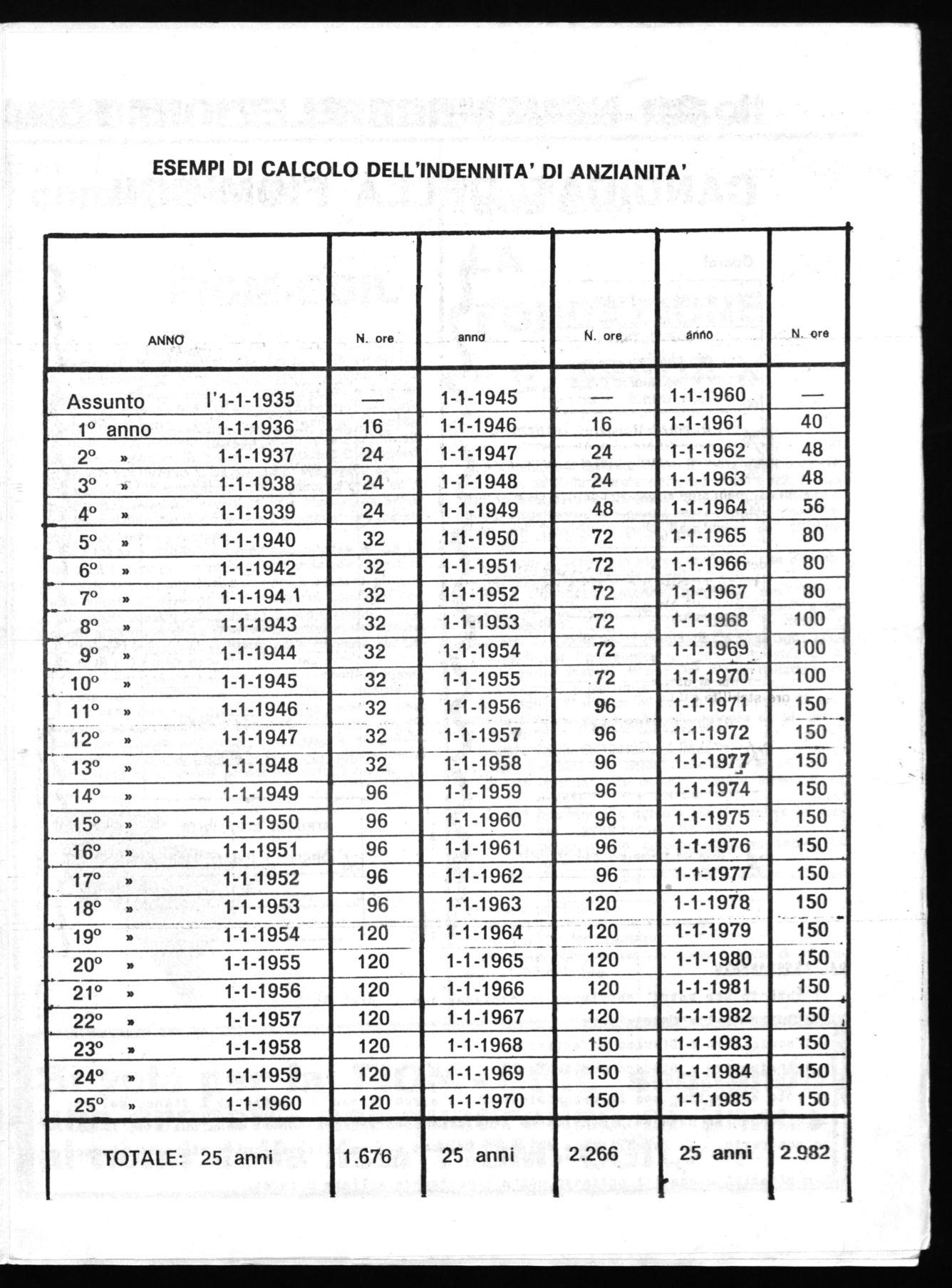 le ore stabilite dal contratto del 1959 per l'anzianità dal 15 gennaio 1948 al 31 dicembre 1962