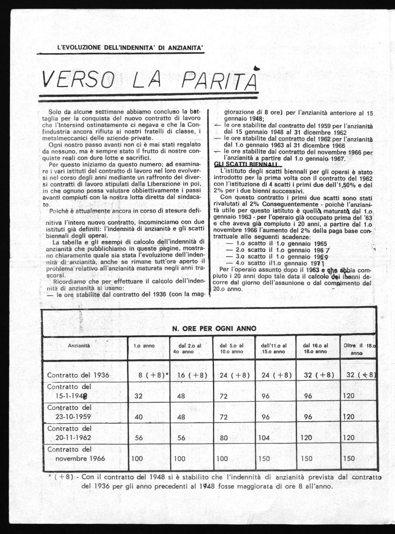 Pnichè è attualmente ancora in corso di stesura definitiva l'intero nuovo contratto, incominciamo con due istituti già definiti: l'indennità di anzianità e gli scatti biennali degli operai.