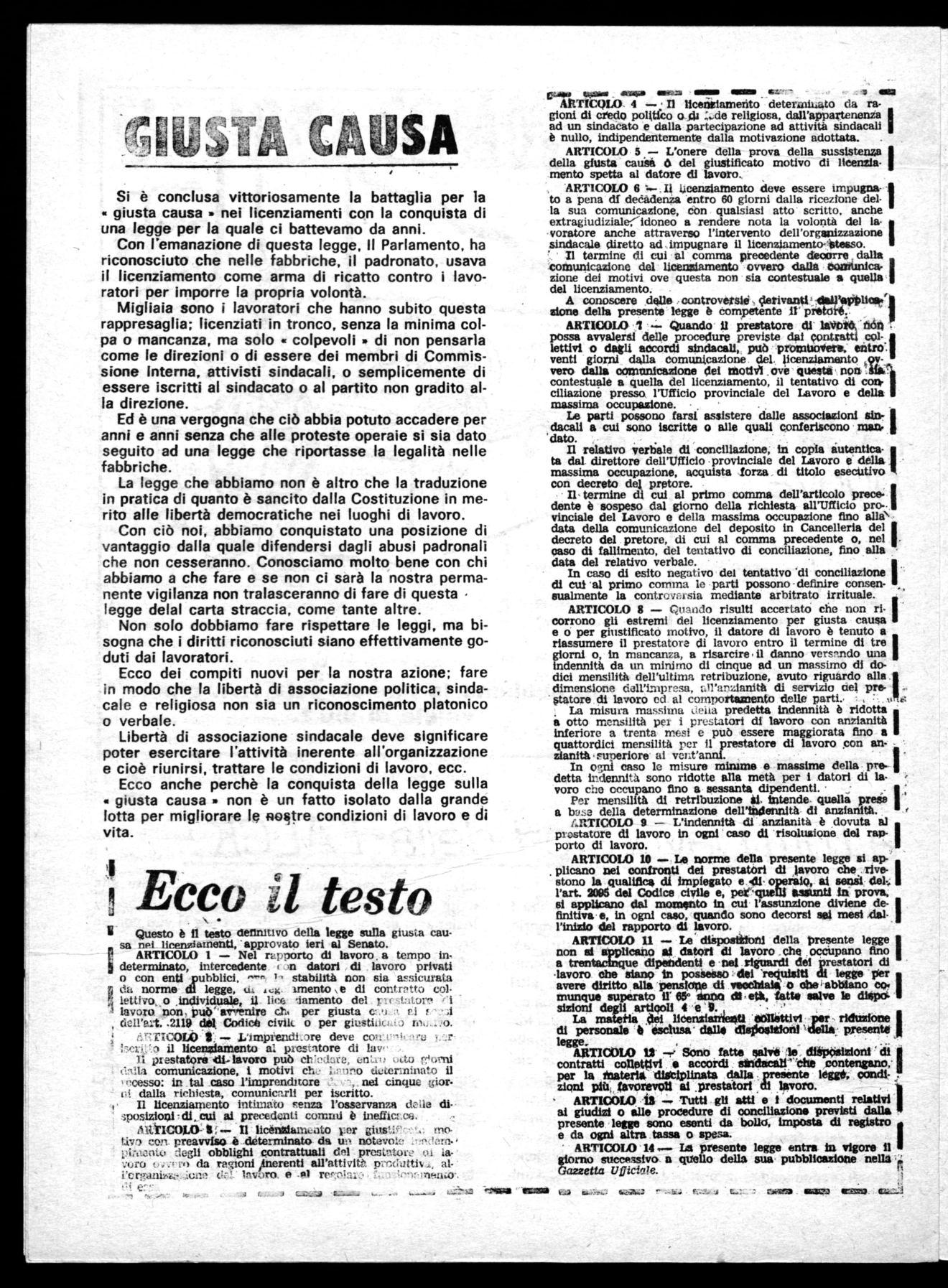 Libertà di associazione sindacale deve significare poter esercitare l'attività inerente all'organizzazione cioè riunirsi, trattare le condizioni di lavoro, ecc. Ecco anche perchè la conquista della legge sulla giusta causa a non è un fatto isolato dalla grande lotta per migliorare le nostre condizioni di lavoro e di vita.