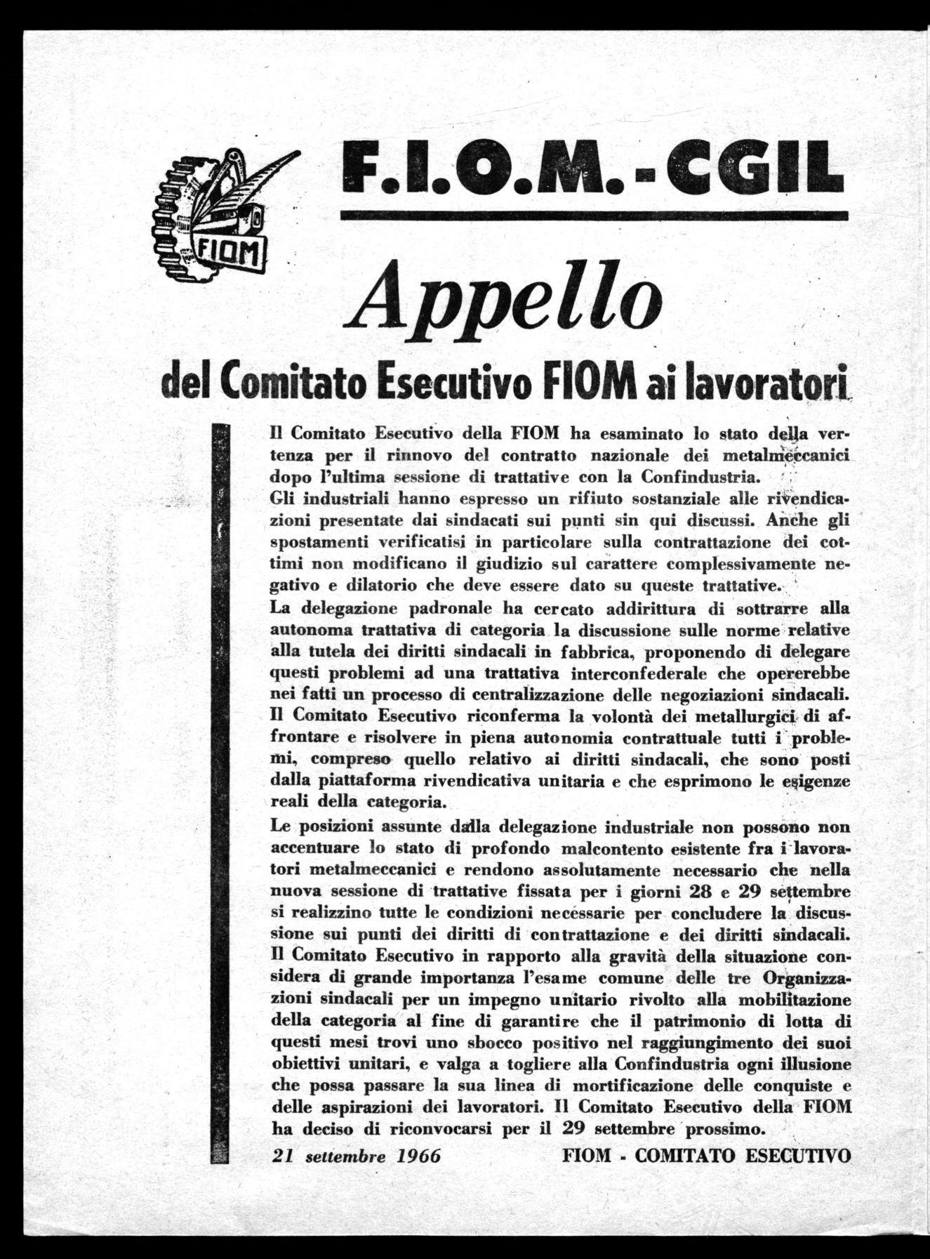 Le posizioni assunte dalla delegazione industriale non possono non accentuare lo stato di profondo malcontento esistente fra i lavoratori metalmeccanici e rendono assolutamente necessario che nella nuova sessione di trattative fissata per i giorni 28 e 29 settembre si realizzino tutte le condizioni necessarie per concludere la discussione sui punti dei diritti di con trattazione e dei diritti sindacali.
