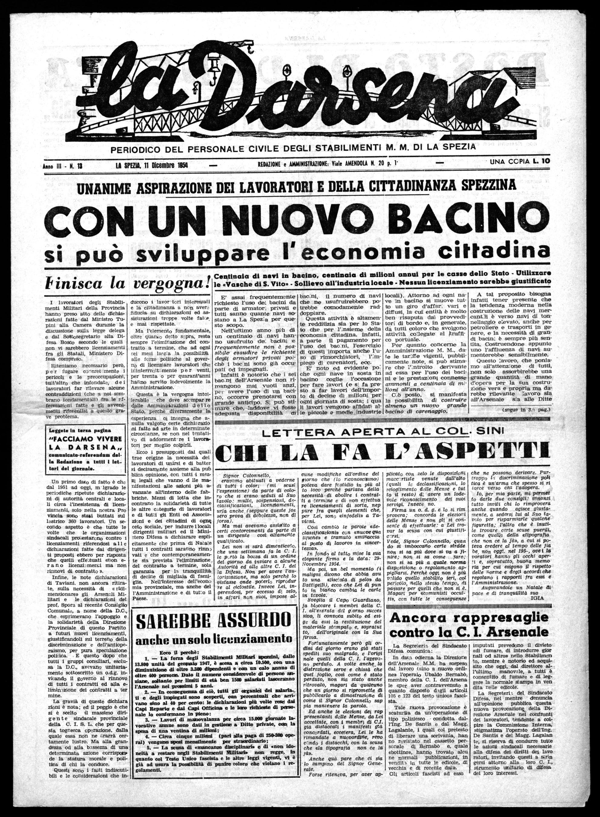 PERIODICO DEL PERSONALE CIVILE DEGLI STABILIMENTI M. M. DI LA SPEZIA Anno III - N. 13 LA SPEZIA, 11Dicembre 1954 REDAZIONE e AMMINISTRAZIONE: Viale AMENDOLA N. 20 p. UNA CCPIA L. 10