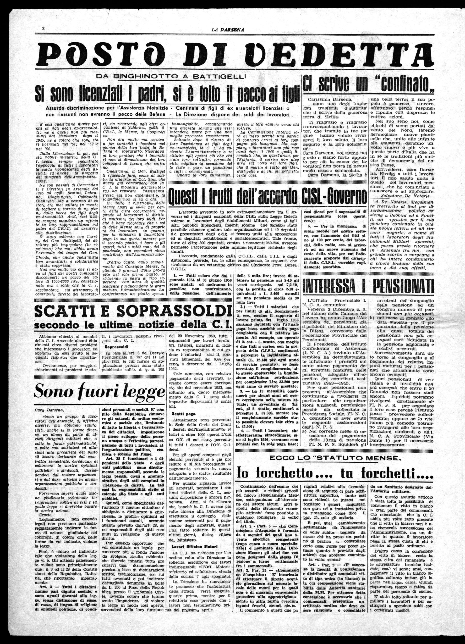 Questo :avaro, che poniamo all'attenzione di tutti, non solo assorbirebbe una grande quantità di mano d'opera per la Sua costruzione vera e propria ma darebbe rilevante lavoro sia all'Arsenale sia alle Ditte (segue in pag.) che ne possono derivare. Purtroppo lo discriminazione poli tira è un'arma che spesso si ri torce verso chi l'adopera. lo, per mia parte, mi permet to darle due consigli: innanzi tutto inviti chi lo rimprovera anche quando agisce giustamente, a sedersi lui al Suo tavolo per risparmiarle qualche figuretta; l'altro che è inutile trovare certe scuse puerili, come quelli della «tipografia che non ce la fa», a cui si poteva credere al tempo delle aia be, non oggi. nel 195-, ove i la voratori hanno gli occhi aperti e, sopratutto, buona memo ria per cui esigono il rispetto delle norme e degli accordi che regolano i rapporti fra essi e l'Amministrazione. Augurandole un Natale di pace e di tranquillità suo IGIA imputati prevedono il divieto «di fumare, di introdurre gior nali od altro» nello Stabilirnen to, mentre è notorio ed acquisito che oggi, dal direttore all'ultimo manovale, a tutti è consentito di fumare e di leggere la normale stampa in ven dita nelle edicole.