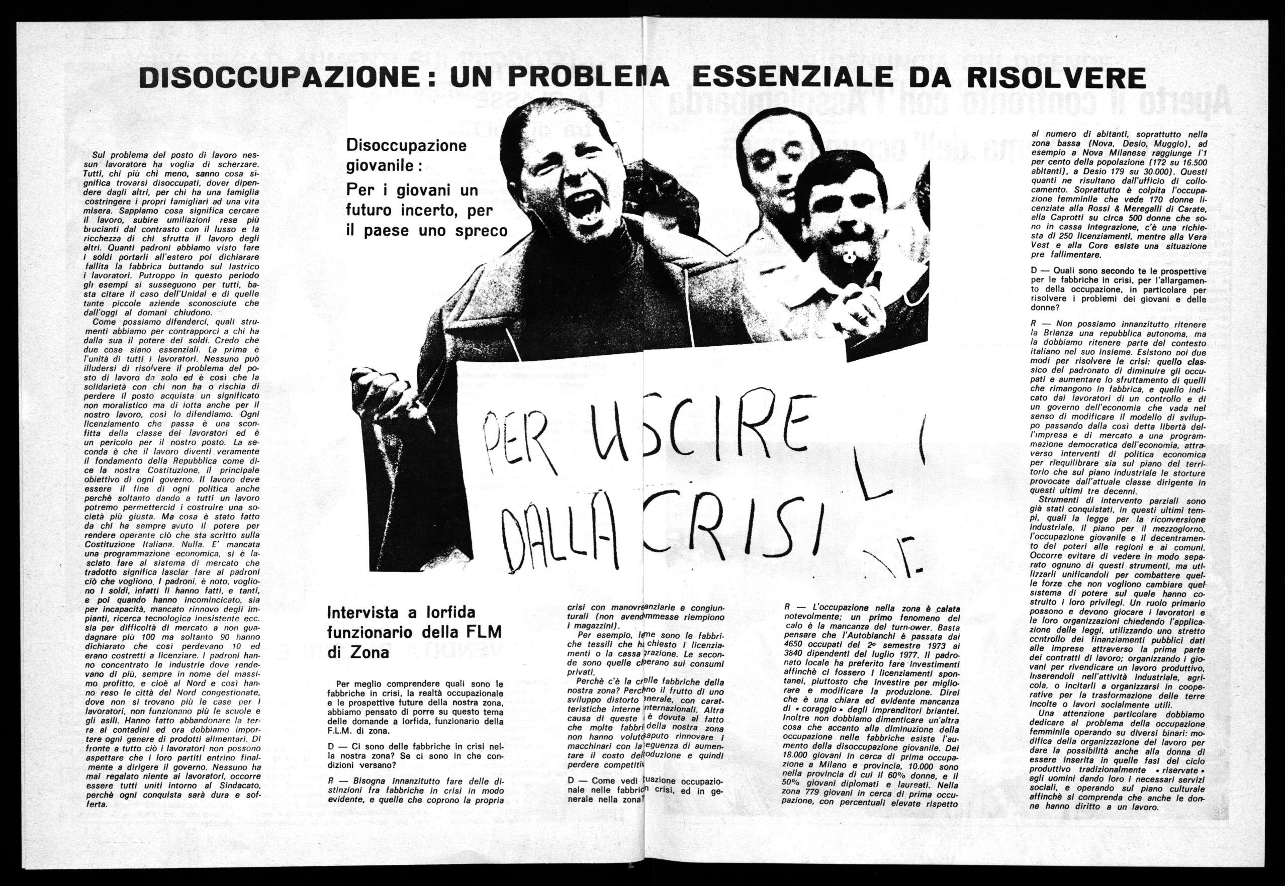 al numero di abitanti, soprattutto nella zona bassa (Nova, Desio, Muggio), ad esempio a Nova Milanese raggiunge l'1 per cento della popolazione (172 su 16.500 abitanti), a Desio 179 su 30.000). Questi quanti ne risultano dall'ufficio di collocamento. Soprattutto è colpita l'occupazione femminile che vede 170 donne licenziate alla Rossi & Mere galli di Cerate, alla Caprotti su circa 500 donne che sono in cassa integrazione, c'è una richiesta di 250 licenziamenti, mentre alla Vera Vest e alla Core esiste una situazione pre fallimentare.