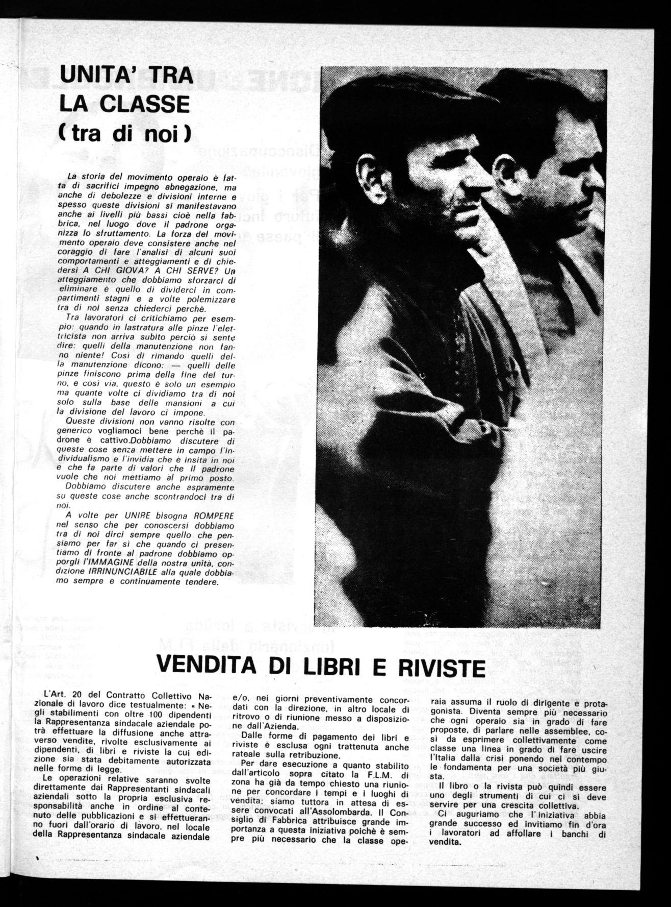 Per dare esecuzione a quanto stabilito dall'articolo sopra citato la F.L.M. di zona ha già da tempo chiesto una riunione per concordare i tempi e i luoghi di vendita; siamo tuttora in attesa di essere convocati all'Assolombarda. Il Consiglio di Fabbrica attribuisce grande importanza a questa iniziativa poichè è sempre più necessario che la classe ope-