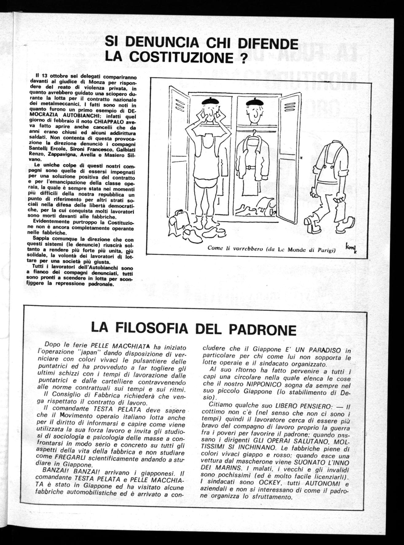 Il 13 ottobre sei delegati compariranno davanti al giudice di Monza per rispondere del reato di violenza privata, in quanto avrebbero guidato una sciopero durante la lotta per il contratto nazionale dei metalmeccanici. I fatti sono noti in quanto furono un primo esempio di DEMOCRAZIA AUTOBIANCHI; infatti quel giorno di febbraio il noto CHIAPPALO aveva fatto aprire anche cancelli che da anni erano chiusi ed alcuni addirittura saldati. Non contenta di questa provocazione la direzione denunciò i compagni Santelli Ercole, Sironi Francesco, Galbiati Renzo, Zappavigna, Avella e Masiero Silvano.