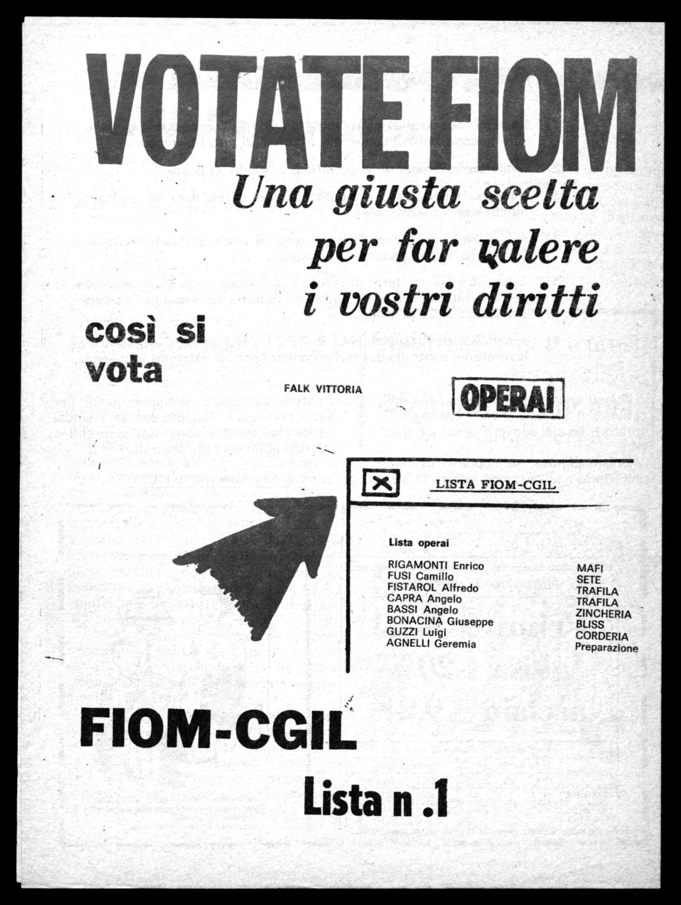 II 18-19 ottobre si rinnovano le C.I. degli stabilimenti di Sesto, Arcore e Porta Romana. La FIOM richiama ancora una volta la vostra attenzione sull'importanza che assume oggi la elezione delle C.I. Voi con il vostro voto eleggete degli uomini e date la vostra preferenza ad una organizzazione sindacale che difenderà i vostri interessi per due anni. Ecco quindi la necessità di una giusta e serena valutazione della scelta. Inoltre il rafforzamento dell'organismo unitario della C.I. si ottiene anche andando tutti a votare, superando se necessario le difficoltà che si possono incontrare (a casa per malattia, infortunio o riposo compensativo) . Oggi votare è un dovere democratico e civile. Votate tutti quindi.