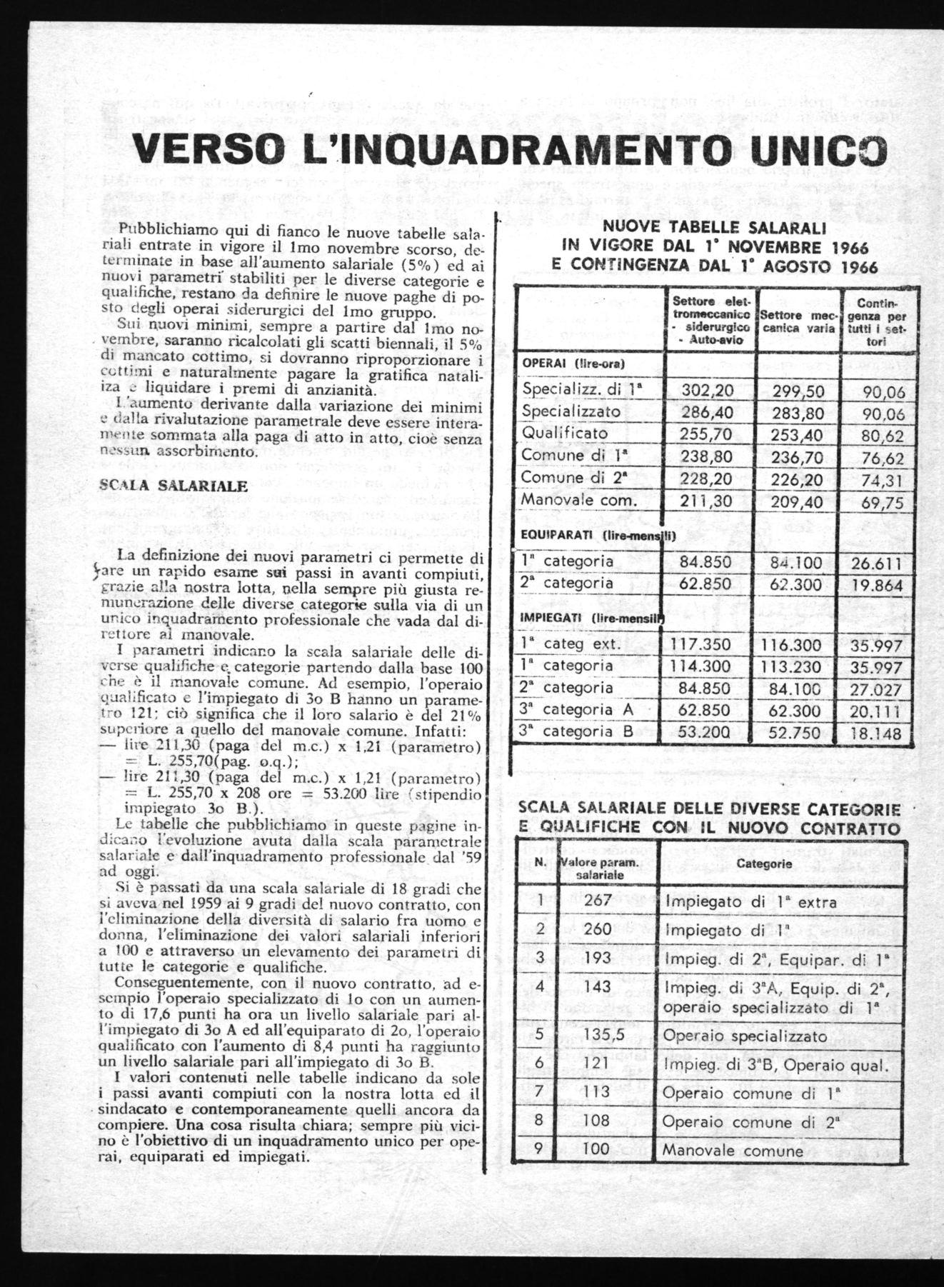 Le tabelle che pubblichiamo in queste pagine indicaao l'evoluzione avuta dalla scala parametrale salariale e dall'inquadramento professionale dal '59 ad oggi.