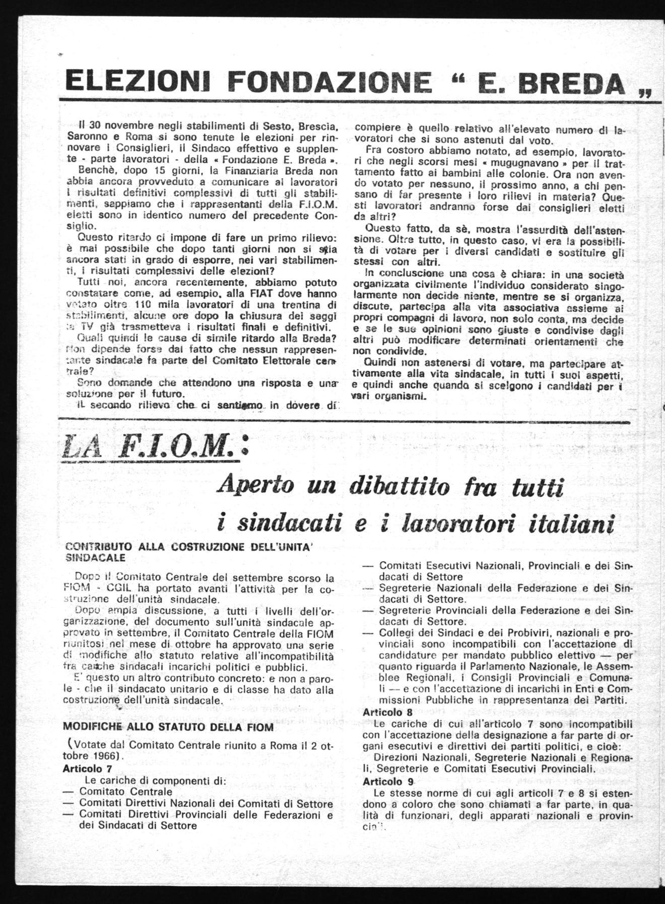 tl 30 novembre negli stabilimenti di Sesto, Brescia, Saronno e Roma si sono tenute le elezioni per rinnovare i Consiglieri, il Sindaco effettivo e supplente - parte lavoratori - della « Fondazione E. Breda a. Benchè, dopo 15 giorni, la Finanziaria Breda non abbia anelata provveduto a comunicare ai lavoratori i risultati definitivi complessivi di tutti gli stabilimenti, sappiamo che i rappresentanti della F.I.O.M. eletti sono in identico numero del precedente Consiglio.
