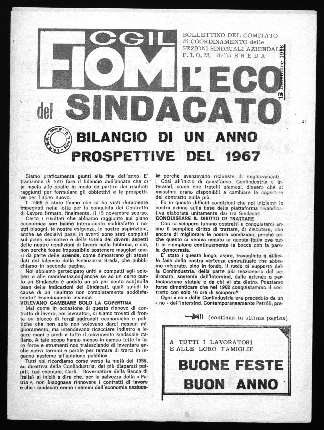 1966 è stato l'anno che ci ha visti duramente impegnati nella lotta per la conquista dei Contratto di Lavoro firmato, finalmente, il 15 novembre scorso. Certo i risultati che abbiamo raggiunto sul piano economico non harrne interamente soddisfatto i nostri bisogni, le nostre esgenze, le nostre aspirazioni, anche se decisivi passi in avanti sono stati compiuti sui piano normativo e deila tutela dei diversi aspetti delle nostre condizioni di lavoro nella fabbrica, e ciò, non perchè fosse impossibile sostenere maggiori oneri da parte delle azende, come dimostrano gli stessi dati del bilancio della FinanzierIa Breda, che pubblichiamo in seconda pagina.