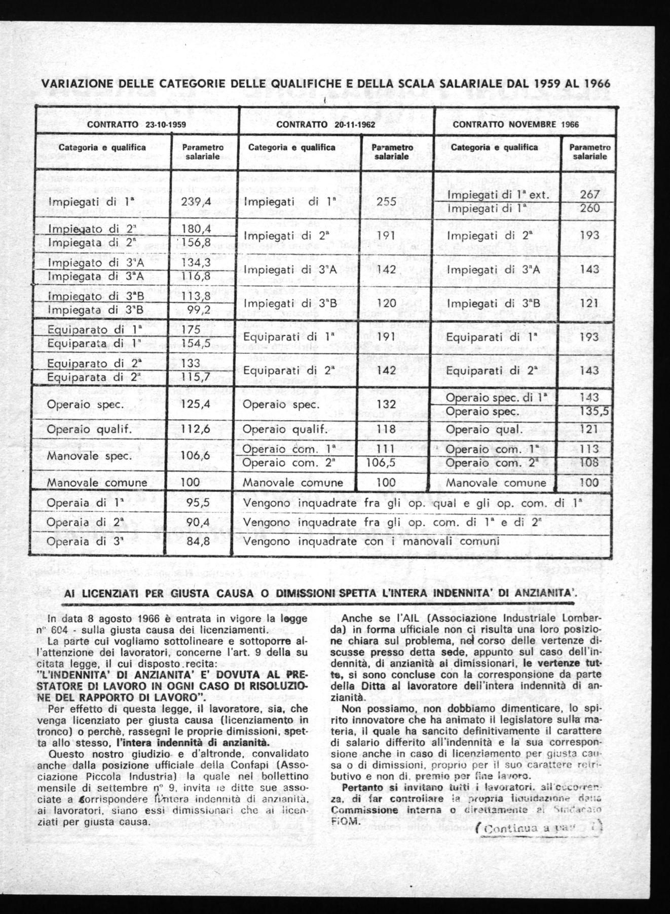 VARIAZIONE DELLE CATEGORIE DELLE QUALIFICHE E DELLA SCALA SALARIALE DAL 1959 AL 1966