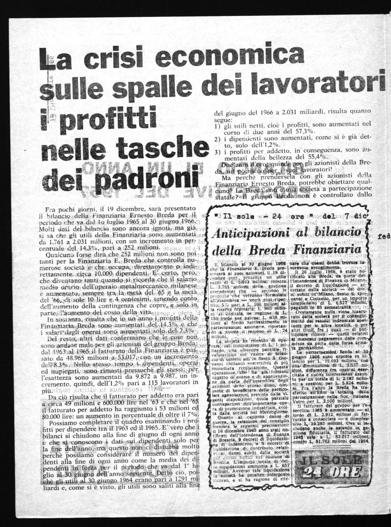 Questa è la situazione della Finanziaria in questi ultimi due anni. Come vadano le sue società, e quelle milanesi in particolare, è presto detto. L'occupazione, operaia ed impiegatizia, va diminuendo: tanto per fare un esempio alla Breda Fucine, in una fabbrica che meno delle altre ha risentito della situazione congiunturale e dove il carico di lavoro del 1965 risultava, a detta della stessa relazione di bilancio, il più elevato degli ultimi anni, l'occupazione è diminuita, tra il '64 ed il '66 del 5% circa. Alla Breda Ferroviaria, una delle fabbriche che ha meno lavoro, l'occupazione è scesa, sempre negli ultimi due anni del 10% circa, ma il bilancio è continuamente in attivo e si continuano a distribuire utili.