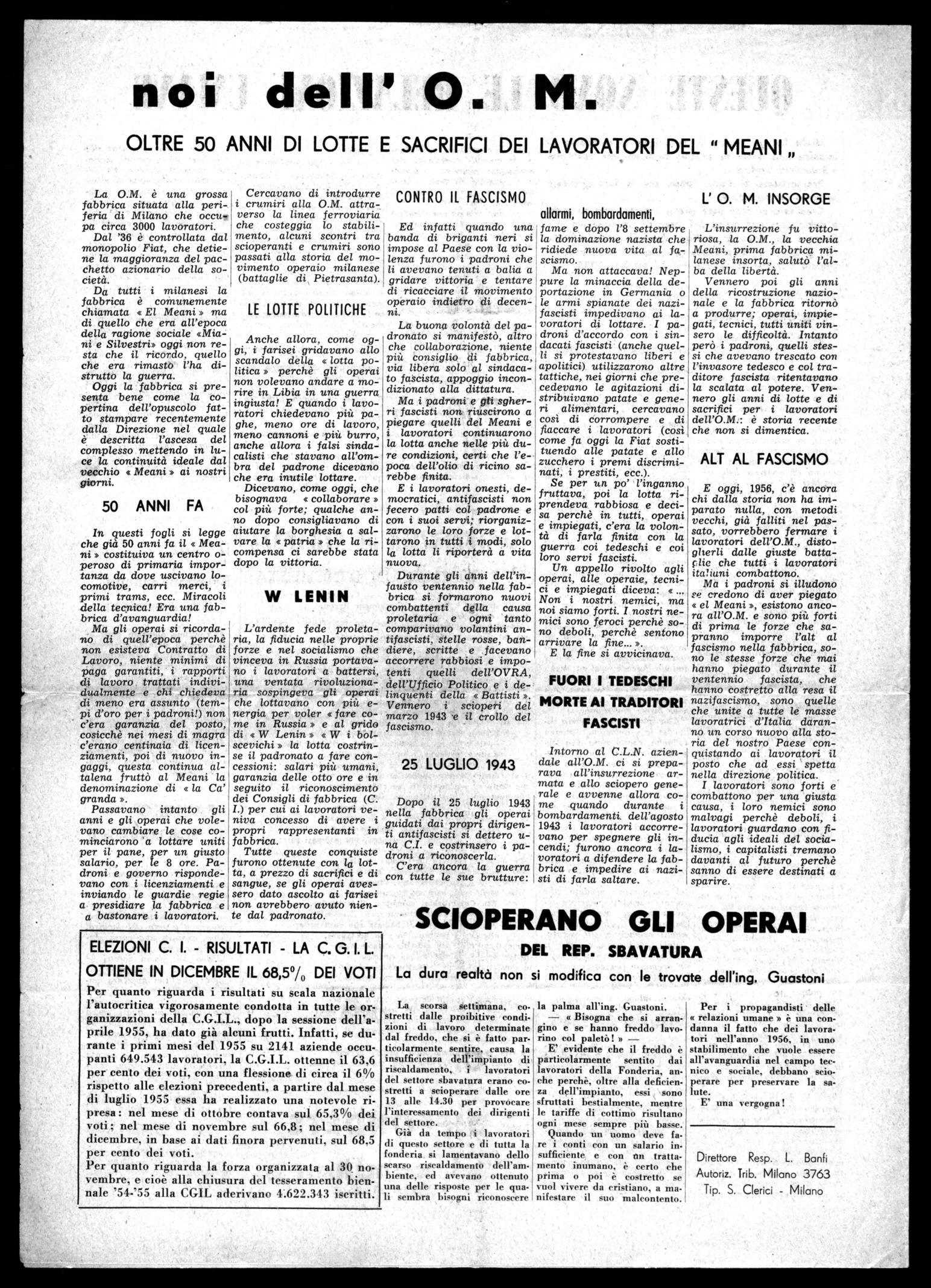 Ma i padroni si illudono re credono di aver piegato « el Meani », esistono ancora all'O.M. e sono più forti di prima le forze che sapranno imporre l'alt al fascismo nella fabbrica, sono le stesse forze che mai hanno piegato durante il ventennio fascista, che hanno costretto alla resa il nazifascismo, sono quelle che unite a tutte le masse lavoratrici d'Italia daranno un corso nuovo alla storia del nostro Paese conquistando ai lavoratori il posto che ad essi spetta nella direzione politica.