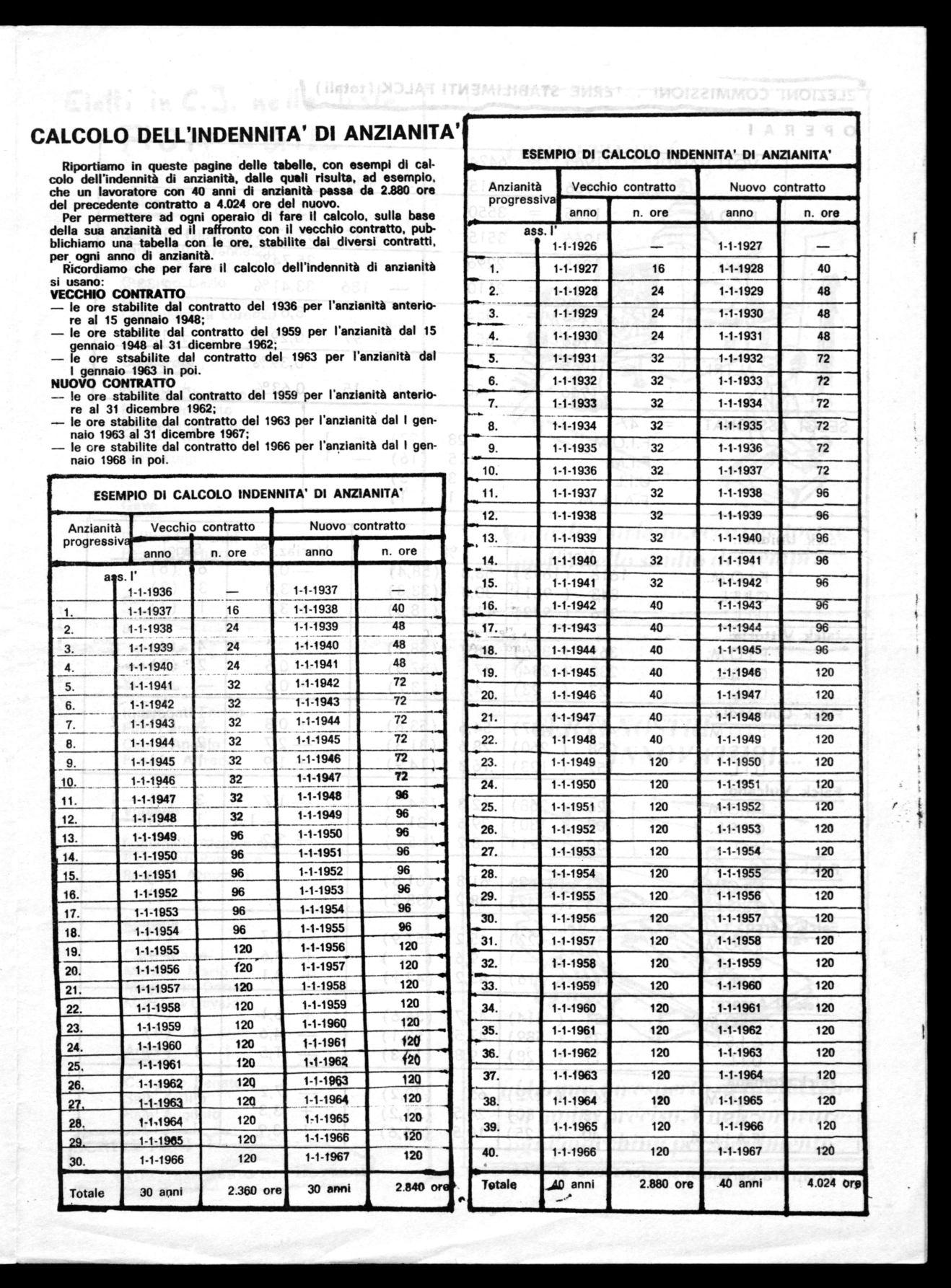 Per permettere ad ogni operaio di fare il calcolo, sulla base della sua anzianità ed il raffronto con il vecchio contratto, pubblichiamo una tabella con le ore, stabilite dai diversi contratti, per ogni anno di anzianità.