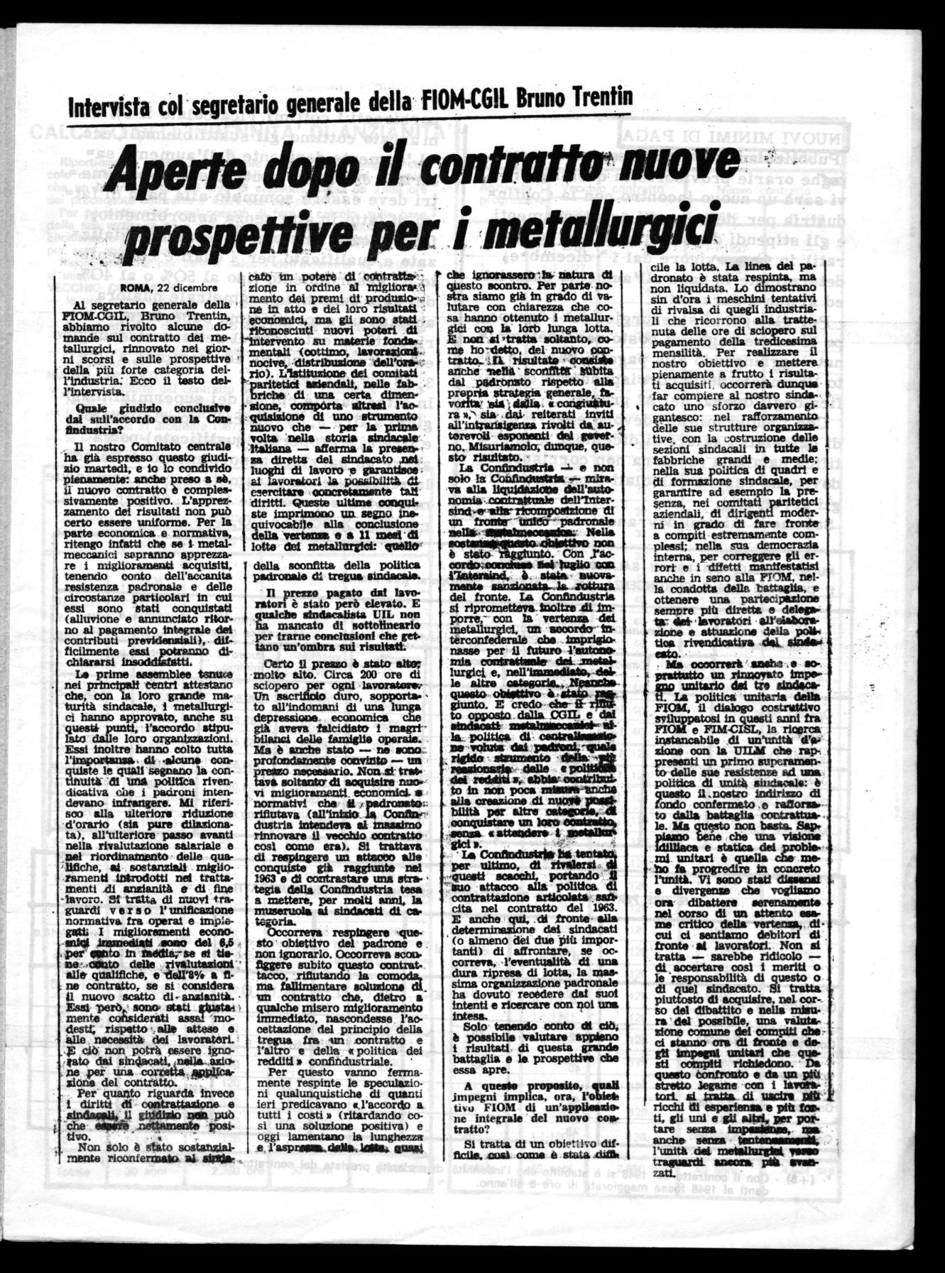 Al segretario generale della FIOM-CGIL, Bruno Trentin, abbiamo rivolto alcune domande sul contratto dei metallurgici, rinnovato nei giorni scorsi e sulle prospettive della più forte categoria dell'industria: Ecco il testo deil'intervista.