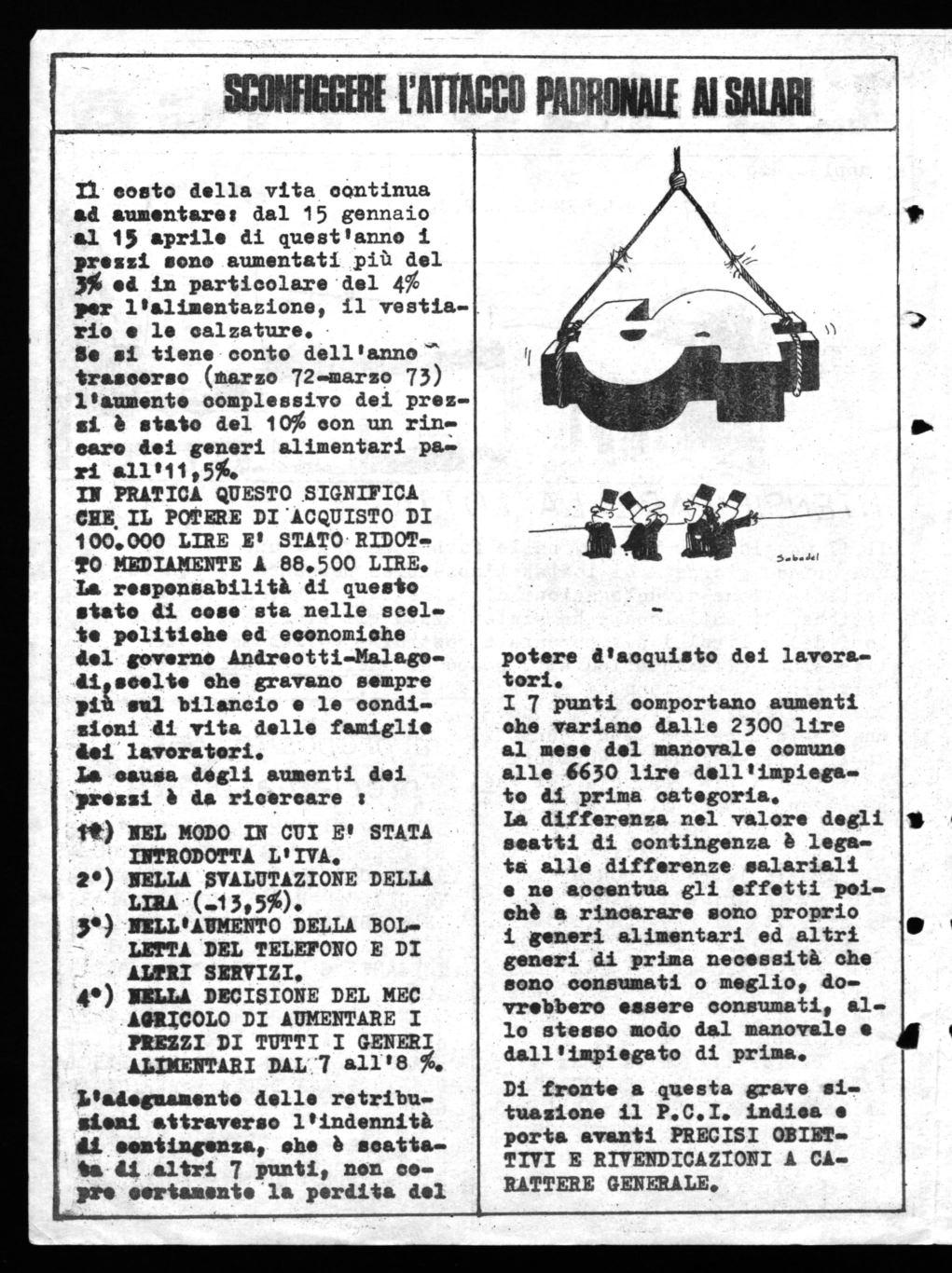 CHE IL POTERE DI 'ACQUISTO DI 100.000 LIRE E' STATO RIDOTTO MEDIAMENTE A 88.500 LIRE. La responsabilità di questo stato di cose sta nelle scelte politiche ed economiche del governo Andreotti-Malagodiomelte che gravano sempre più sul bilancio e le condizioni di vita delle famiglie dei lavoratori.