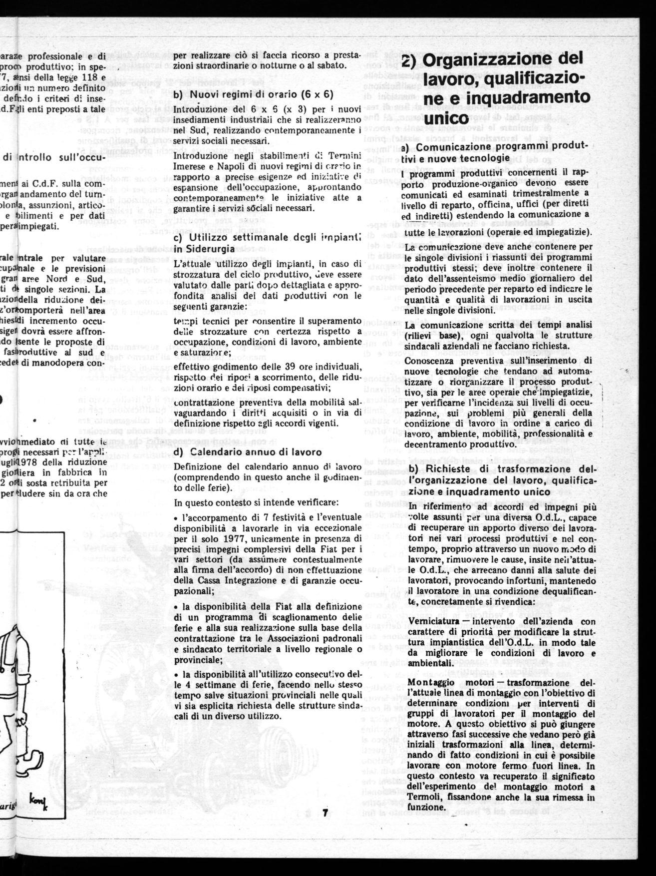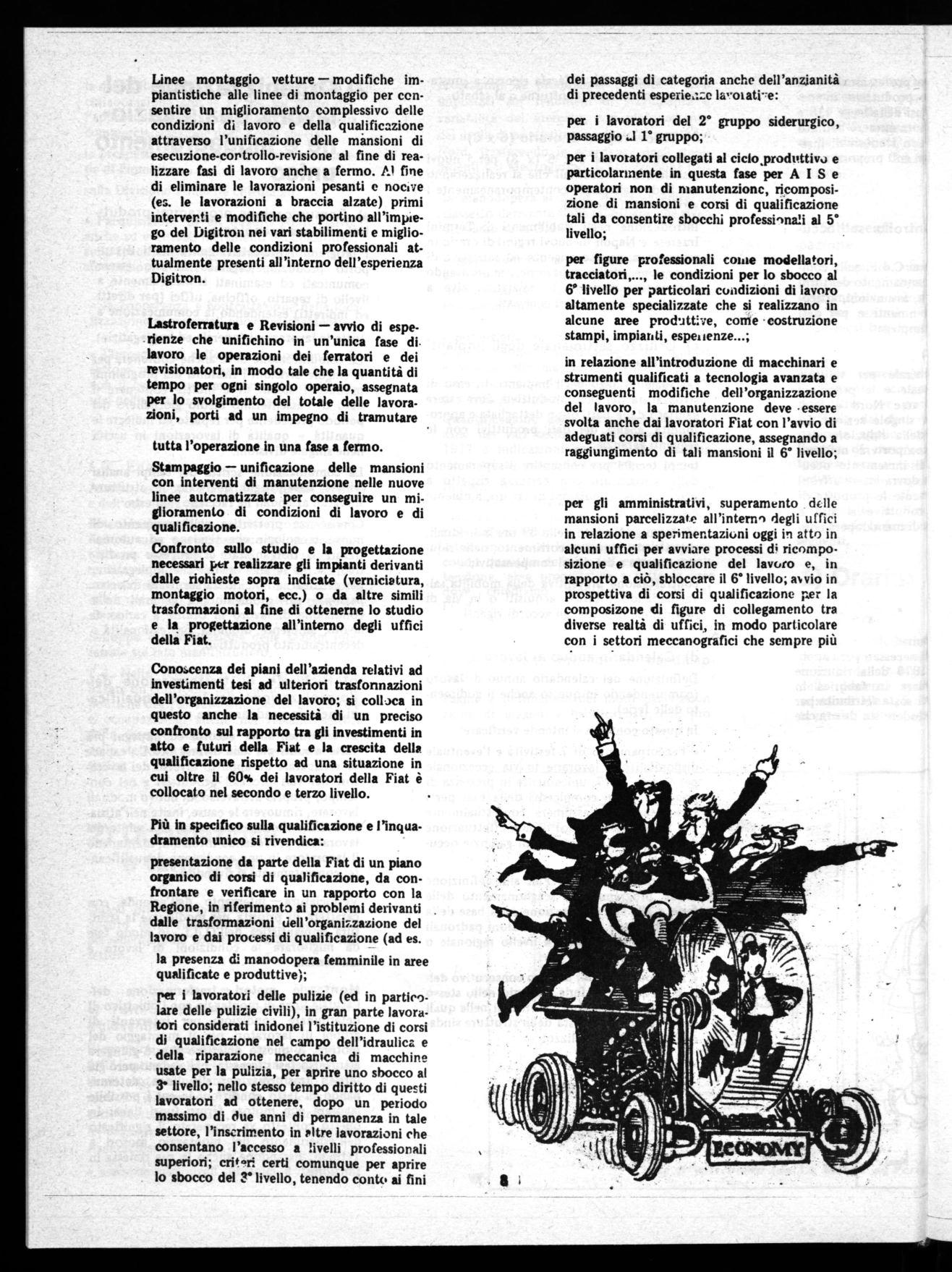 Più in specifico sulla qualificazione e l'inquadramento unico si rivendica: presentazione da parte della Fiat di un piano organico di corsi di qualificazione, da confrontare e verificare in un rapporto con la Regione, in riferimento ai problemi derivanti dalle trasformazioni dell'organizzazione del lavoro e dai processi di qualificazione (ad es. la presenza di manodopera femminile in aree qualificate e produttive);