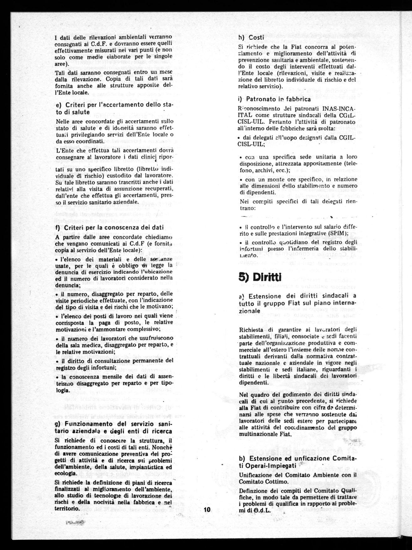 Si richiede che la Fiat concorra al potenziamento e miglioramento dell'attività di prevenzione sanitaria e ambientale, sostenendo il costo degli interventi effettuati dall'Ente locale (rilevazioni, visite e realiz:sazione del libretto individuale di rischio e del relativo servizio).