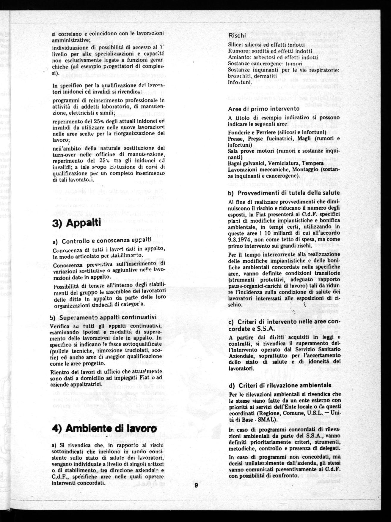 Al fine di realizzare provvedimenti che diminuiscono il rischio e riducano il numero degli esposti, la Fiat presenterà ai C.d.F. specifici piani di modifiche impiantistiche e bonifica ambientale, in tempi certi, utilizzando in queste aree i 10 miliardi di cui all'accordo 9.3.1974, non come tetto di spesa, ma come primo intervento sui grandi rischi.