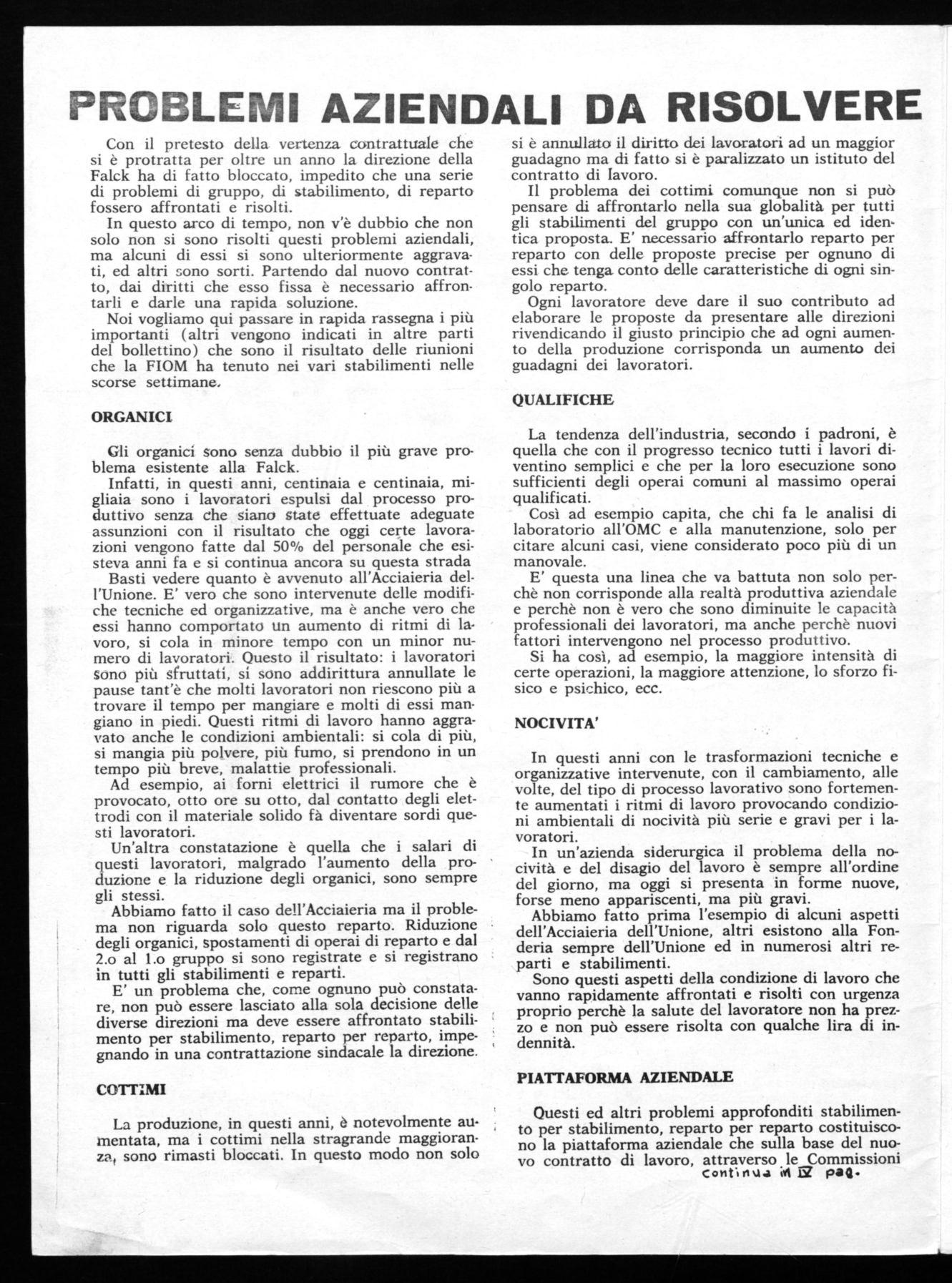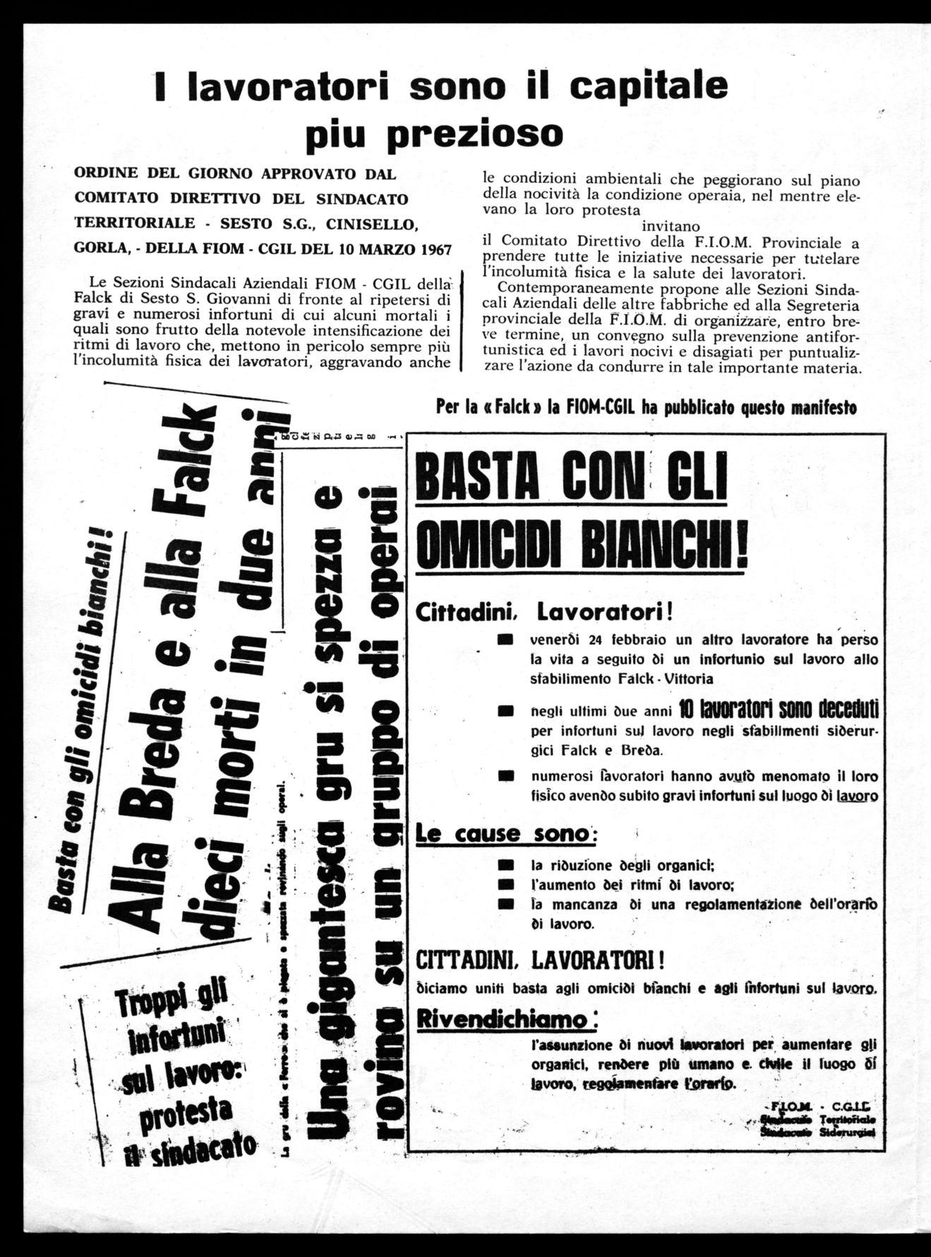 Le Sezioni Sindacali Aziendali FIOM - CGIL della Falck di Sesto S. Giovanni di fronte al ripetersi di gravi e numerosi infortuni di cui alcuni mortali i quali sono frutto della notevole intensificazione dei ritmi di lavoro che, mettono in pericolo sempre più l'incolumità fisica dei lavoratori, aggravando anche