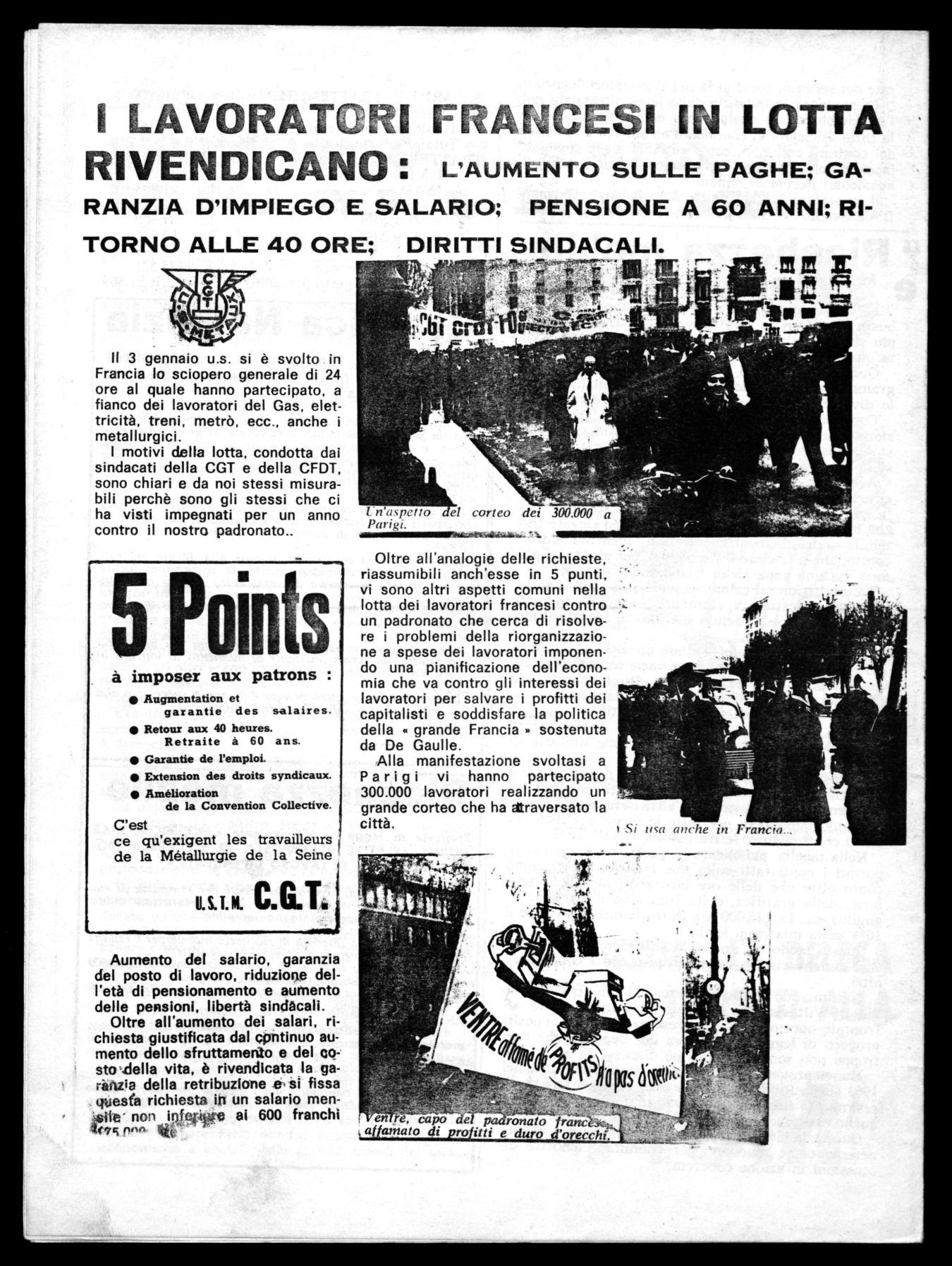 Oltre all'analogie delle richieste, riassumibili anch'esse in 5 punti, vi sono altri aspetti comuni nella lotta dei lavoratori francesi contro un padronato che cerca di risolvere i problemi della riorganizzazione a spese dei lavoratori imponendo una pianificazione dell'economia che va contro gli interessi dei lavoratori per salvare i profitti dei capitalisti e soddisfare la politica della grande Francia » sostenuta da De Gaulle.