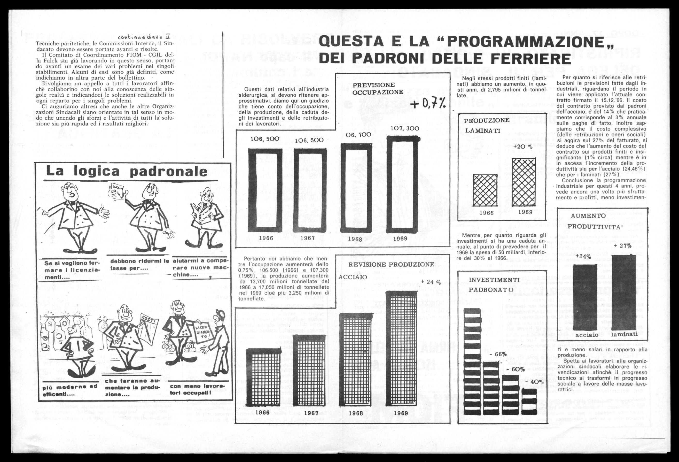 Per quanto si riferisce alle retribuzioni le previsioni fatte dagli industriali, riguardano il periodo in cui viene applicato l'attuale contratto firmato il 15.12.'66. Il costo del contratto previsto dai padroni dell'acciaio, è del 14% che praticamente corrisponde al 3% annuale sulle paghe di fatto, inoltre sappiamo che il costo complessivo (delle retribuzioni e oneri sociali) si aggira sul 27% del fatturato, si deduce che l'aumento del costo del contratto sui prodotti finiti è insígnificante (1% circa) mentre è in in ascesa l'incremento della produttività sia per l'acciaio (24,46%) che per i laminati (27%).
