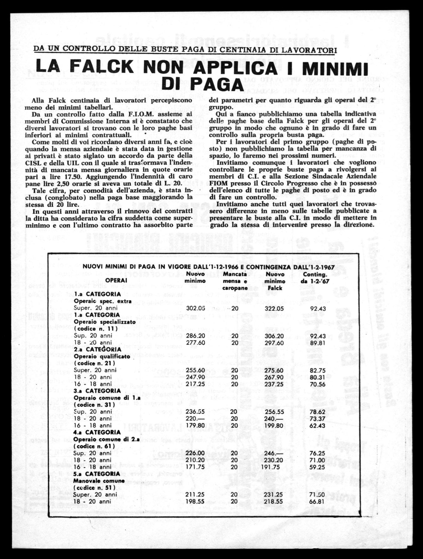 Qui a fianco pubblichiamo una tabella indicativa delle paghe base della Falck per gli operai del 2' gruppo in modo che ognuno è in grado di fare un controllo sulla propria busta paga.