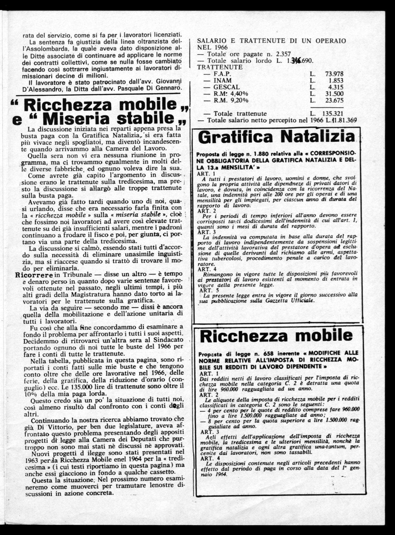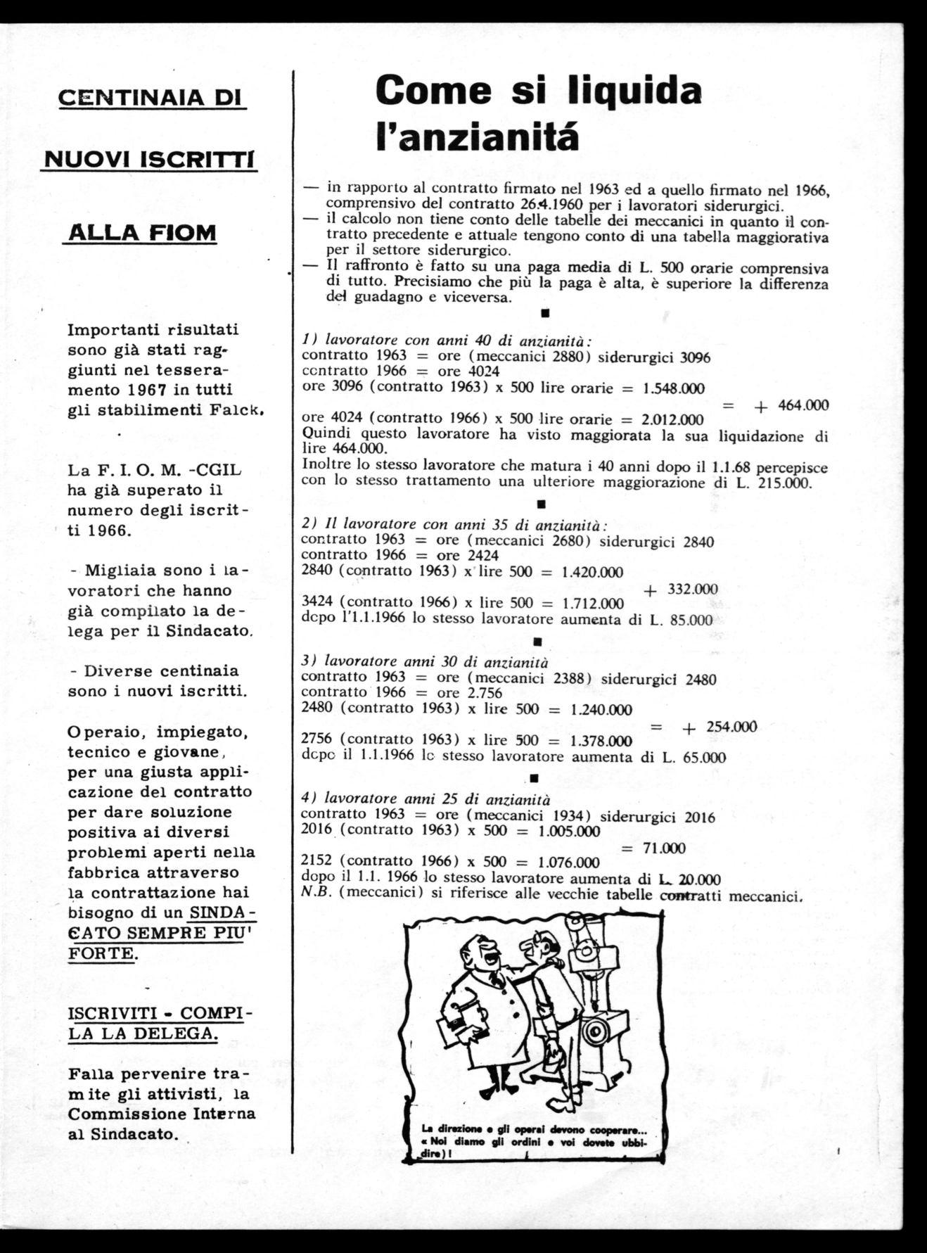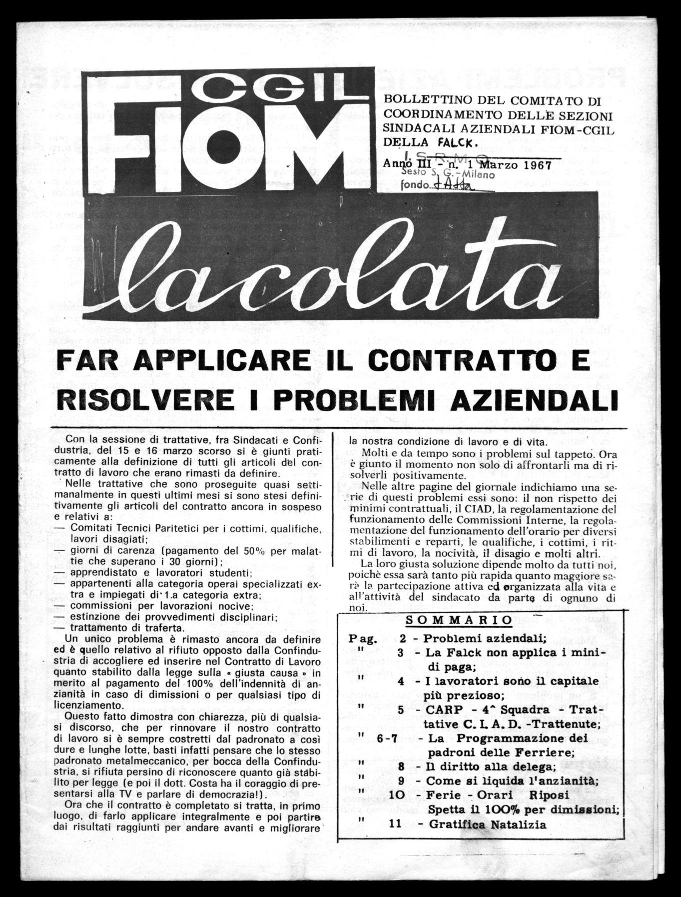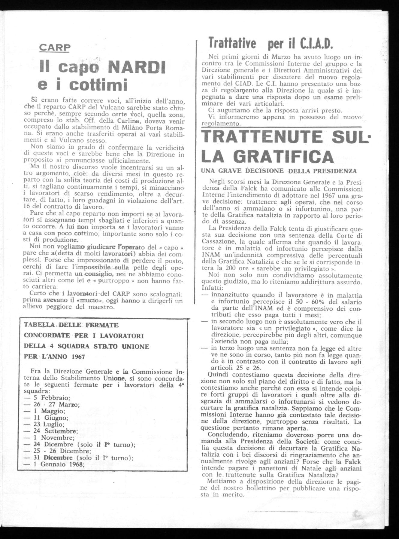 Negli scorsi mesi la Direzione Generale e la Presidenza della Falck ha comunicato alle Commissioni Interne l'intendimento di adottare nel 1967 una grave decisione: trattenere agli operai, che nel corso dell'anno si ammalano o si infortunino, una parte della Gratifica natalizia in rapporto al loro periodo di assenza.